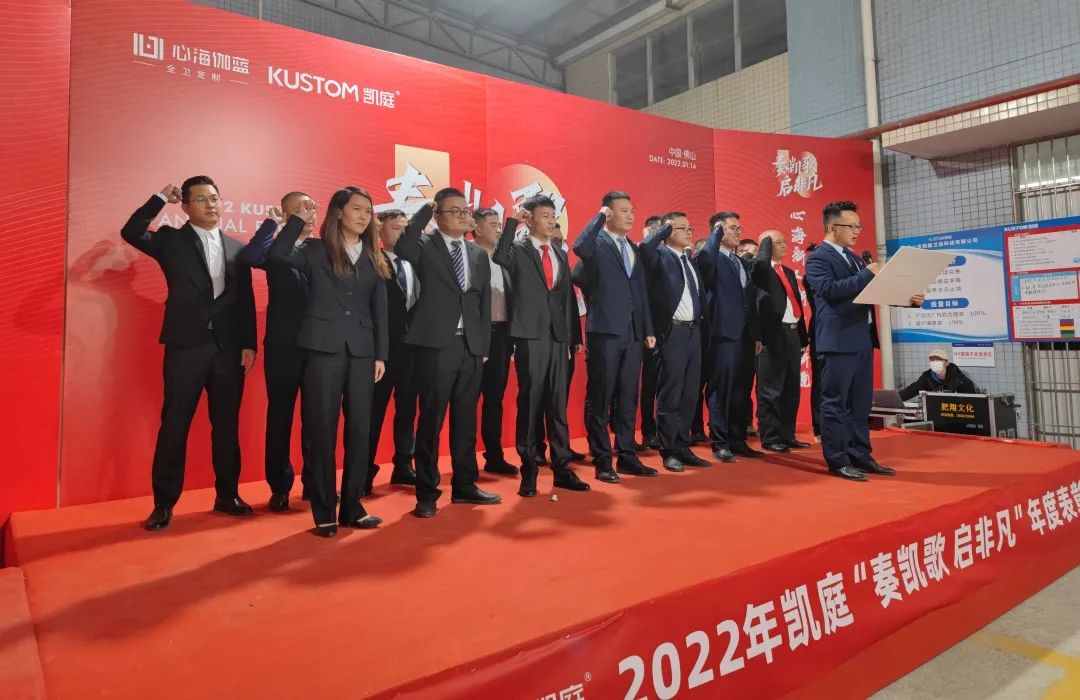 2022的目标宣誓环节将表彰大会推向了高潮,佛山伽蓝、清远伽蓝、营销中心、赢伽电商、凯庭淋浴房、雅颂卫浴,艾素出口各分公司事业部分别进行了激扬的宣誓。