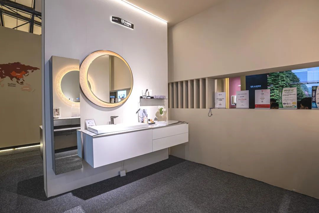 心海伽蓝展位现场展出10余款新品,包含典雅中式、法式浪漫,极简高奢的成品浴柜、亦有雅奢高定系列与纤凝东方美学等全卫产品,新品系列线条优美,间或典雅古韵,间或极简自然。