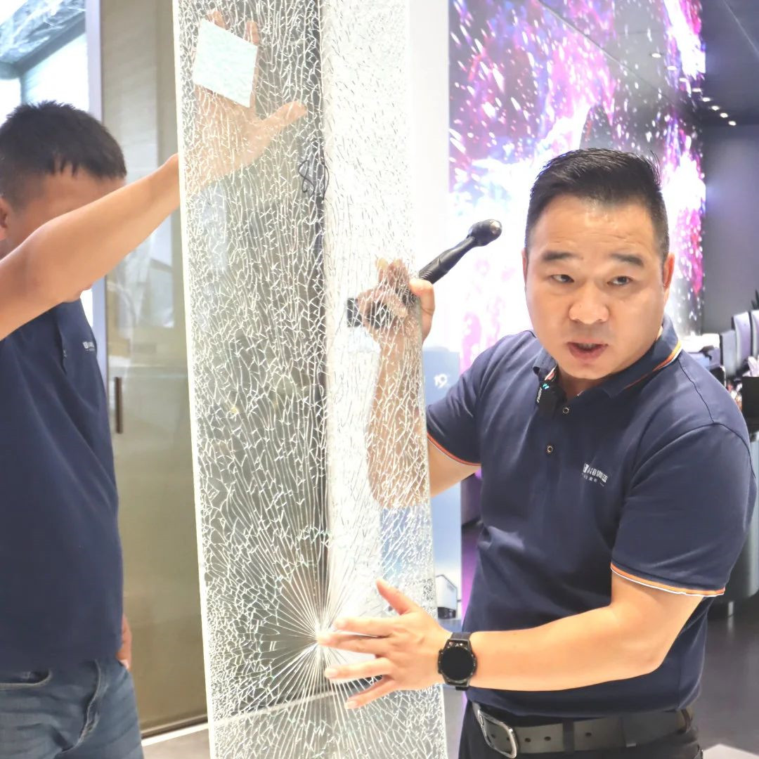 淋浴房营销总监陶林则与同事一起,以惊心动魄的对比试验人员展现了夹胶玻璃的安全优势,直播间的氛围一度达到高潮。比起贴膜玻璃淋浴房,心海伽蓝夹胶玻璃淋浴房即使发生自曝仍可以保持直立,不会出现碎片飞溅。