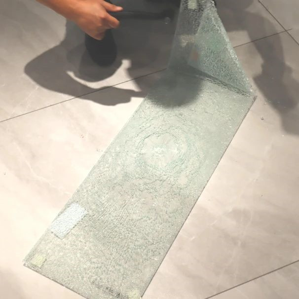 注:心海伽蓝夹胶玻璃淋浴房(上图):即使发生千分之三的玻璃自爆,仍能保持直立,不会倒塌且玻璃裂而不缺,表面光滑,可以用皮肤触碰。下图为破碎的贴膜钢化玻璃,断裂且有少量碎片飞溅。