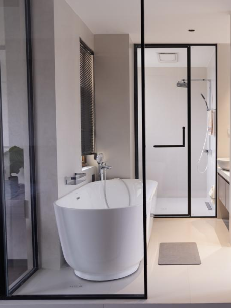 葛女士对家里卫浴间需求是实用舒适,颜值风格高雅靓丽,针对主卧和其他卫浴间,葛女士与设计师进行了沟通讨论,主卫选择了曙光系列浴室柜,其他卫浴空间分别选用了断舍离KL810779、骑士系列WX814417、以及浴室柜KL810711等产品。