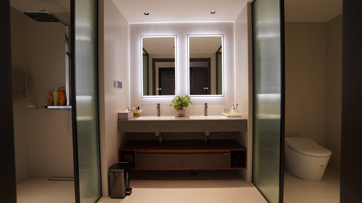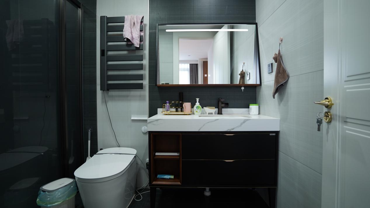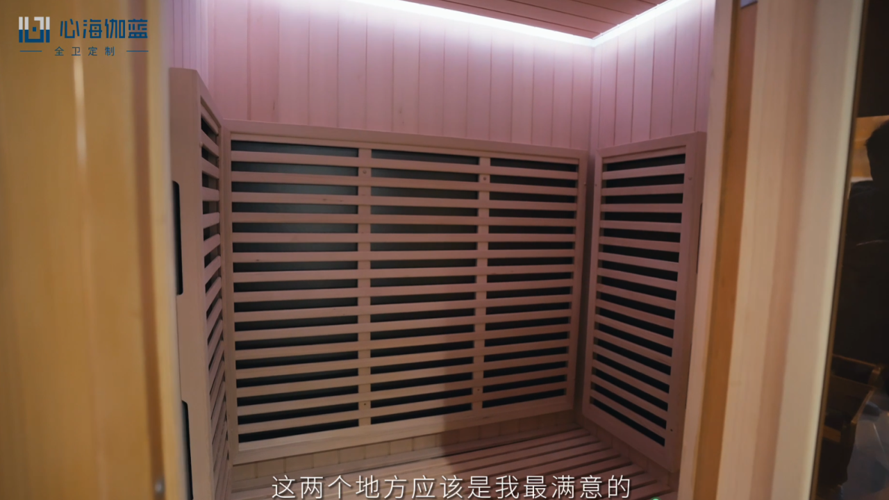 “全卫定制”为葛女士打造一个理想的浴室空间提供了便利。首先,定制浴室柜可充分利用空间,优化空间布局,在浴室中增加更多的储物空间,轻松地整理和收纳各种洗浴用品、护肤品,毛巾及生活其他必需品。其次,定制浴室间的设计可以避免卫生死角,确保每个角落都容易清洁和维护,有助于保持浴室的卫生,减少细菌滋生的机会,为家人提供一个更加健康和舒适的环境。最后,葛女士家里的卫浴空间很大,在规划外安装了汗蒸房,既可充分利用卫浴空间,又可get居家运动后的健康享受。