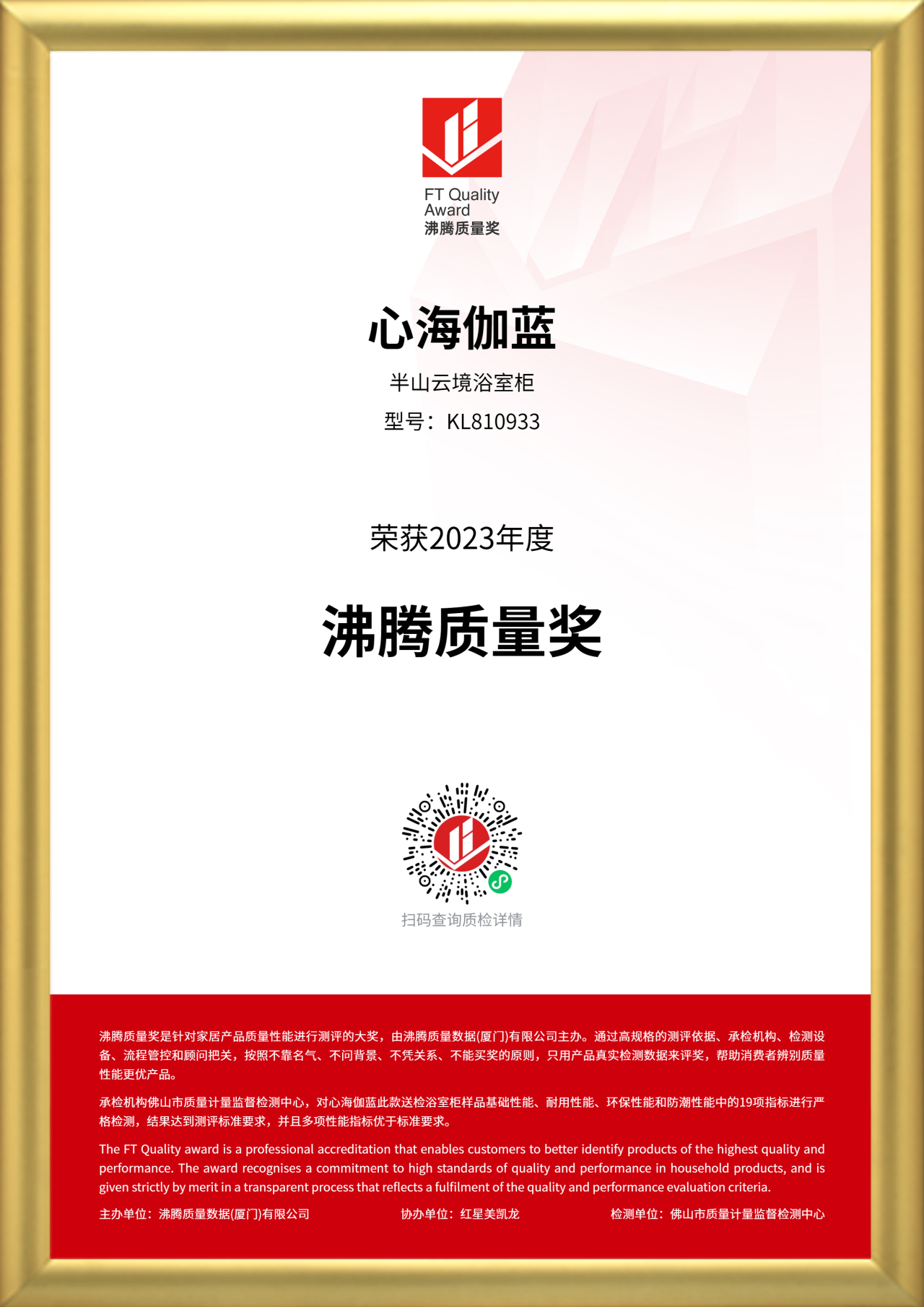 在2023年10月沸腾质量奖测评中,心海伽蓝参评的半山云境浴室柜(KL810933)、秋语浴室柜(KL810947),荣获“沸腾质量奖”。承检机构佛山市质量计量监督检测中心,对心海伽蓝以上两款送检浴室柜样品基础性能、耐用性能、环保性能和防潮性能中的19项指标进行严格检测,结果均达到测评标准要求,并且多项性能指标优于标准要求。