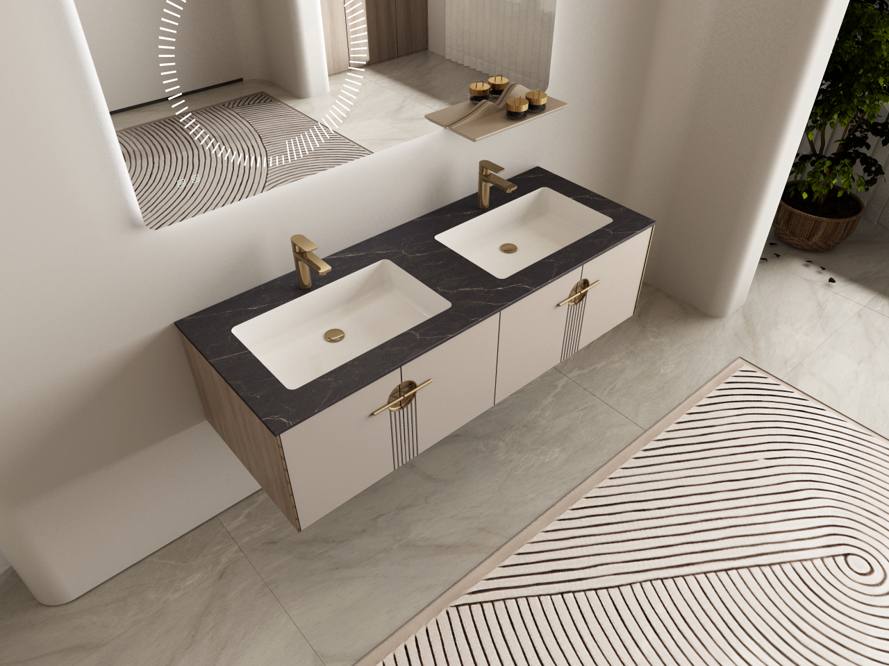 新中式风格的浴室柜半山云境,展现东方柔和美感,莎士比亚黑岩板台面肌理清雅自然,搭配无缝拼接盆,无死角易清洁;磨砂造型镜面,环形流水灯自带轻盈呼吸感,360度照亮面部轮廓美;镜下特设造型金属托架,显绵绵山丘状,于家居空间沉浸式体味东方韵味。