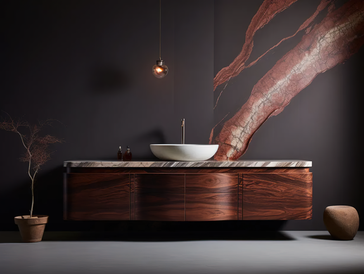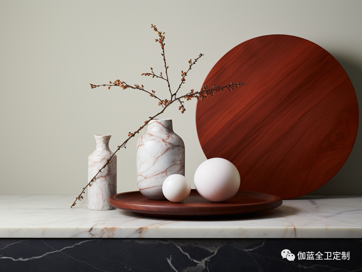 其独特的纹理质感不仅为空间增添了触感层次,更展现了自然之美。花梨木与大理石的这种搭配,将精致与高雅融合,为卫浴空间注入了独特的魅力和品质。
