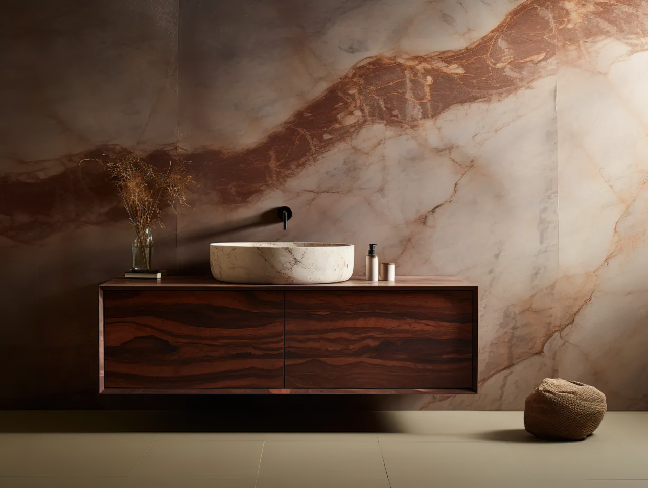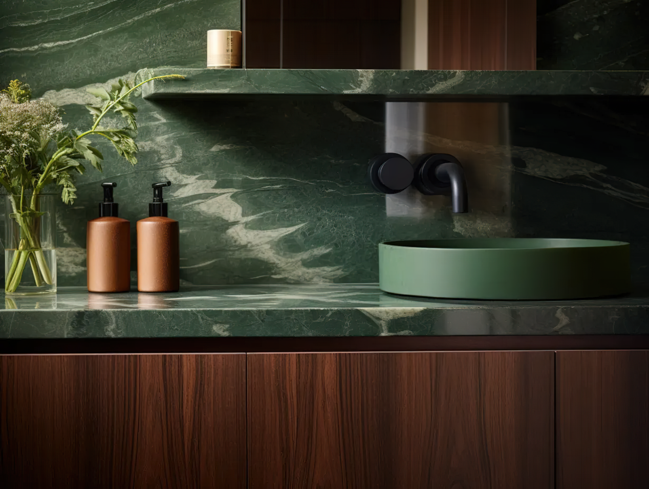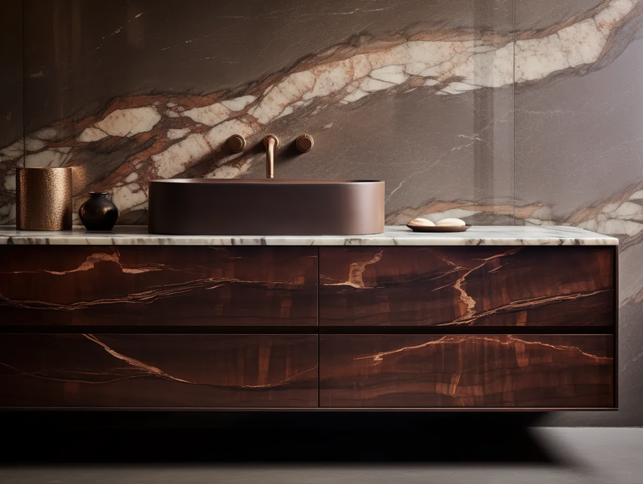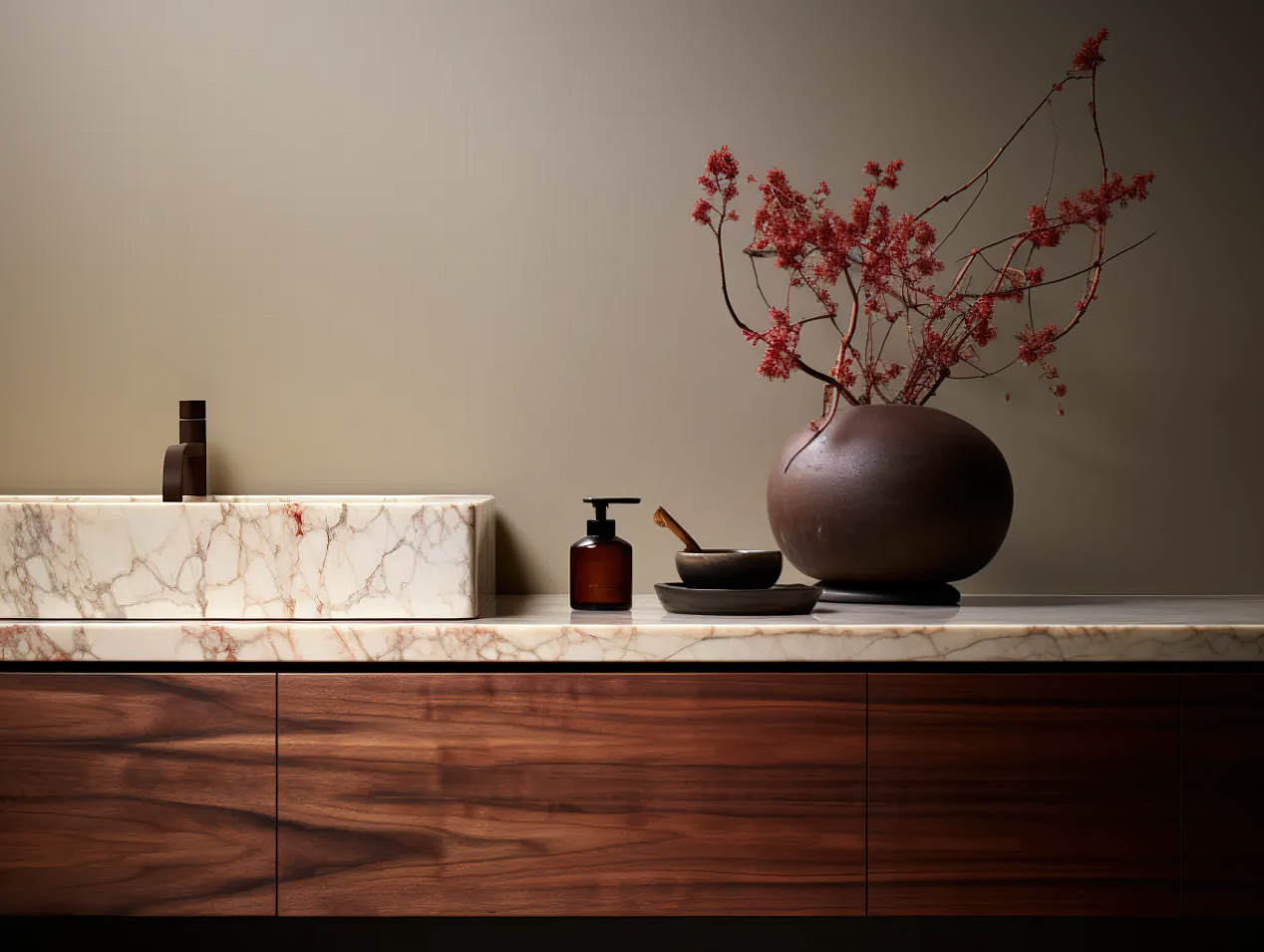 其优雅的色彩与大理石台面相得益彰,为卫浴空间增添了温暖和尊贵感。