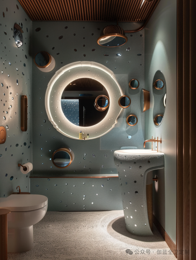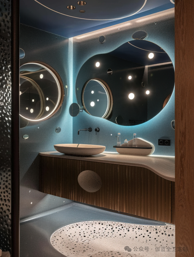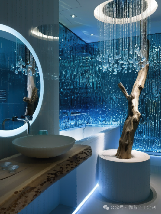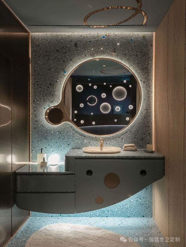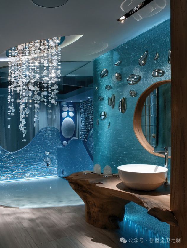 深邃的海蓝,搭配灵动的气泡,圆形镜面如同深海探险者的观察窗。独特的灯光设计如同深海中的一点星光,为现代感与科技感的融合提供了完美的注解。