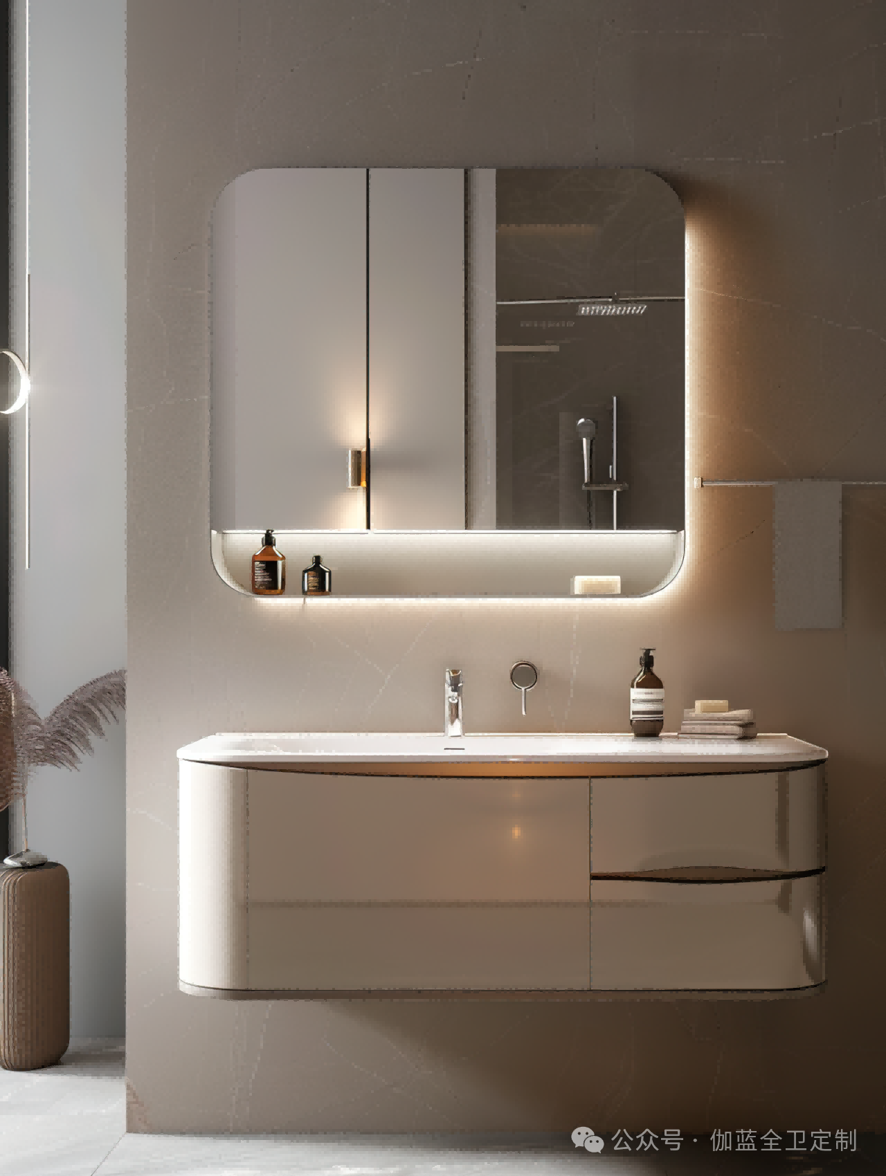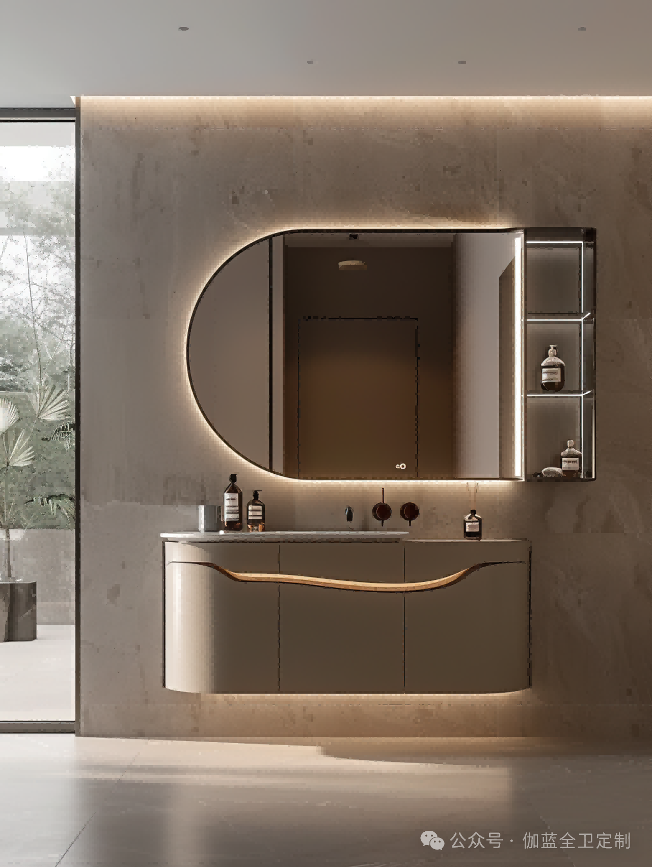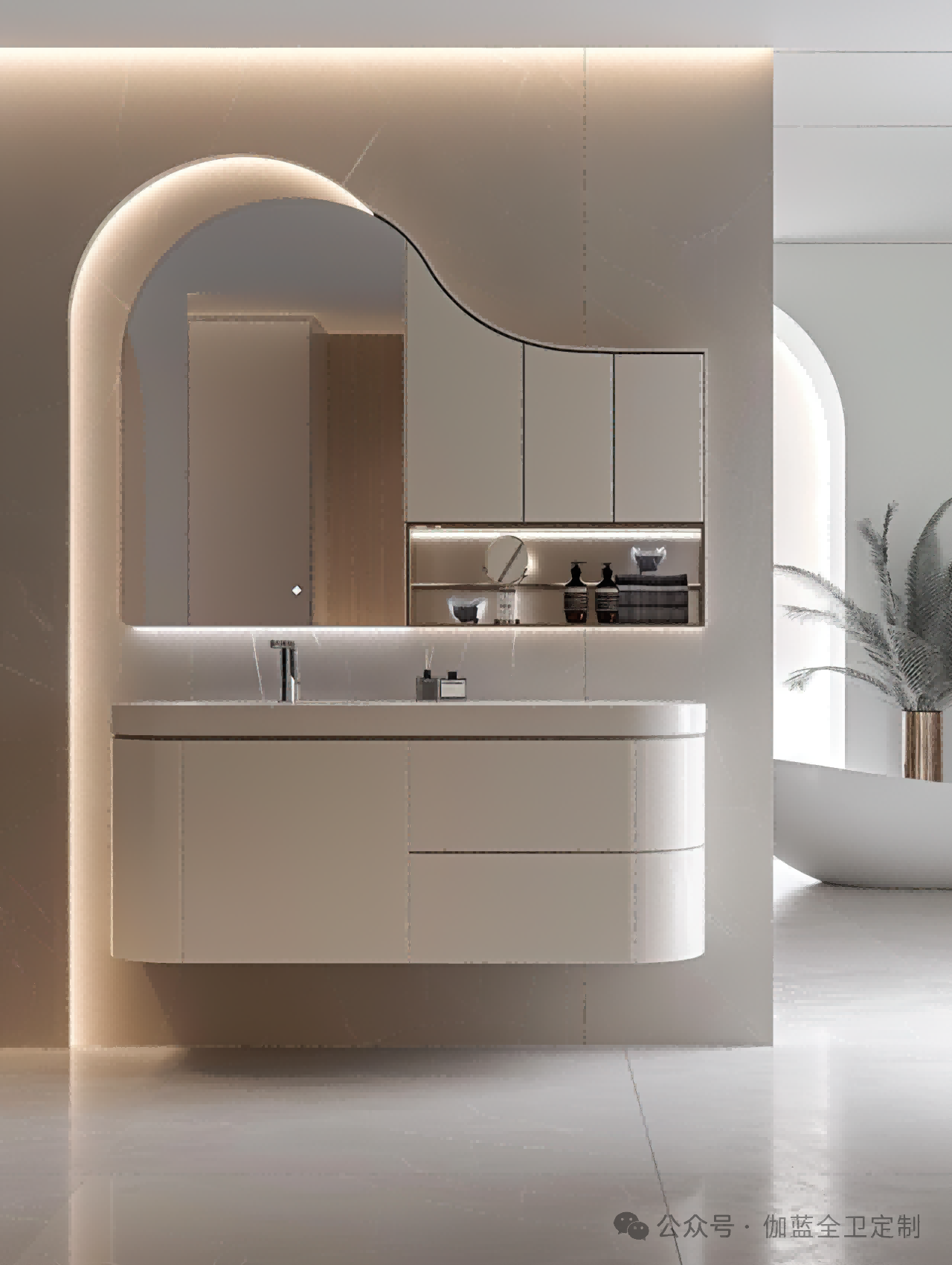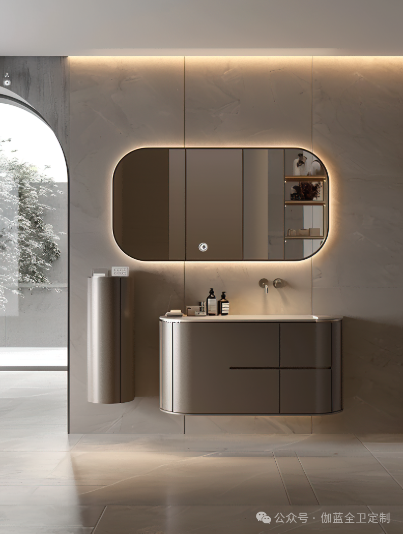 布局:柔和的弧形镜面与圆润的柜体设计相得益彰,空间布局极致简洁,却不失细节之美。
