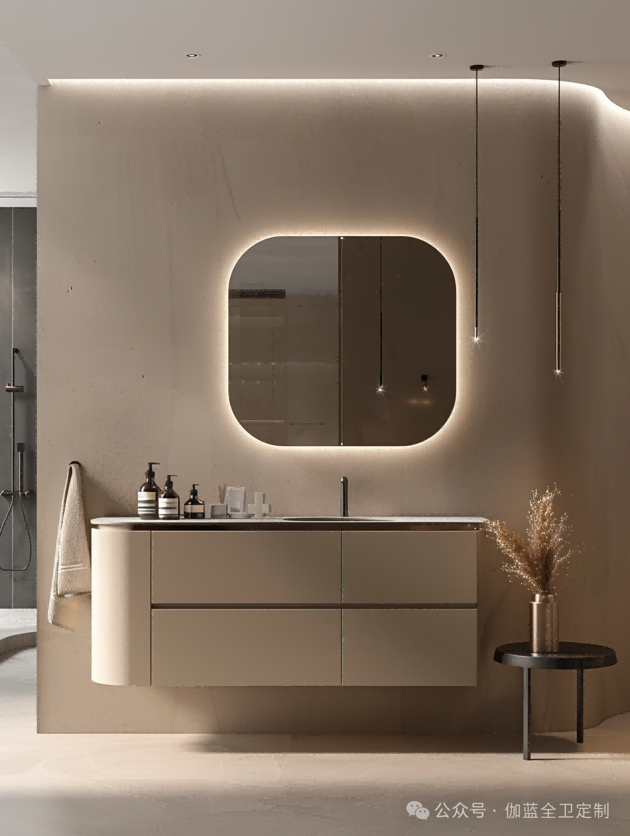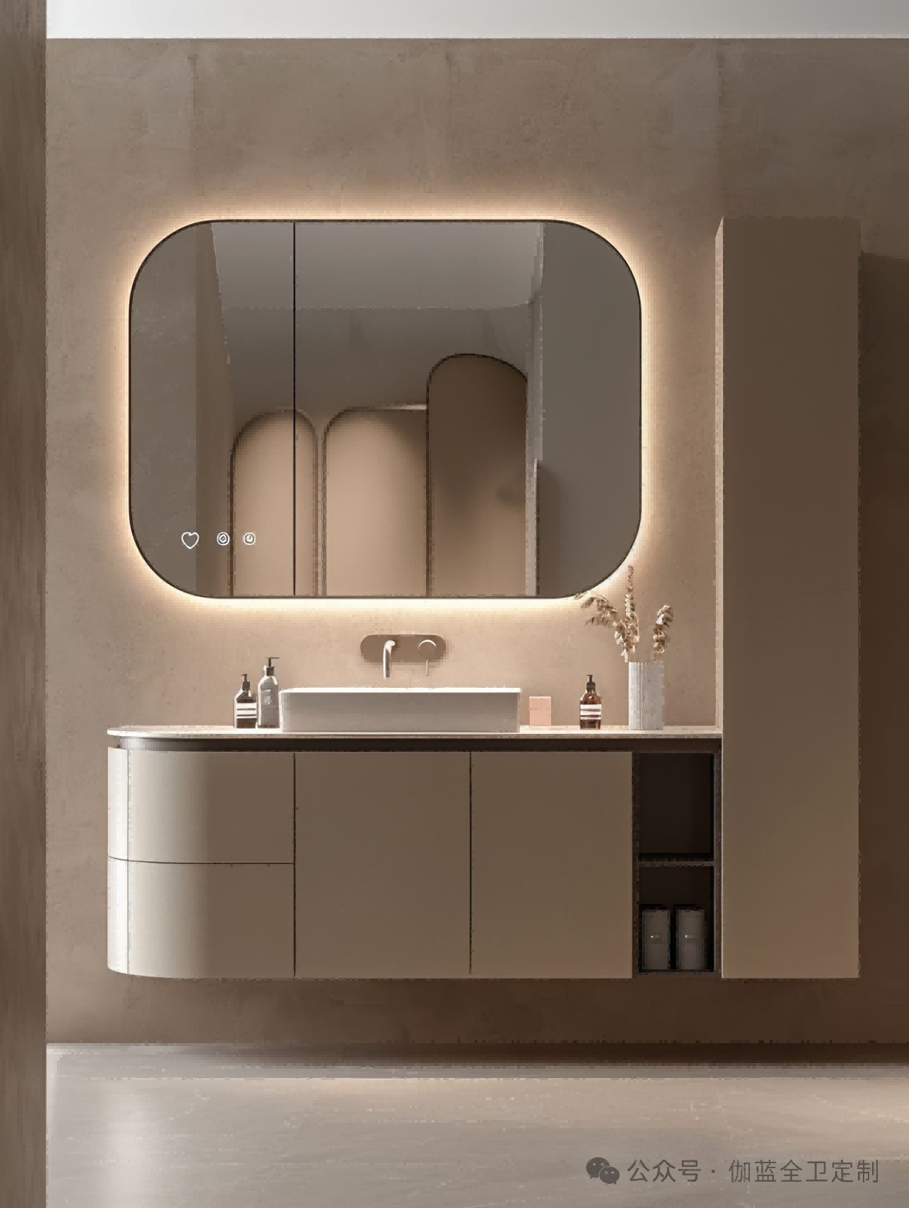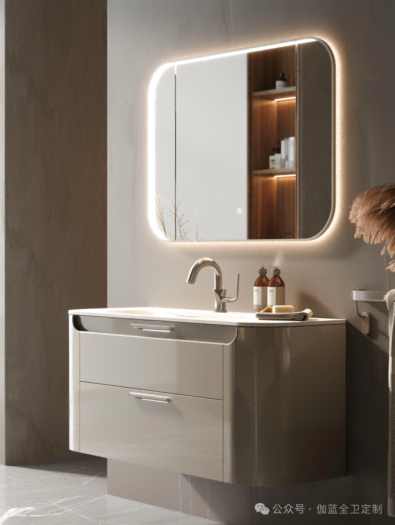 布局:柔和的弧形镜面与圆润的柜体设计相得益彰,空间布局极致简洁,却不失细节之美。