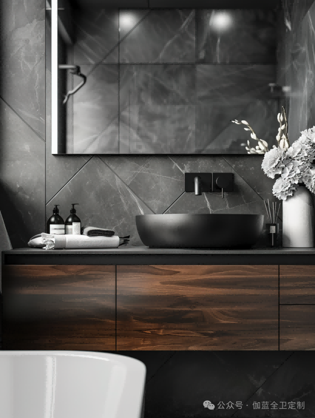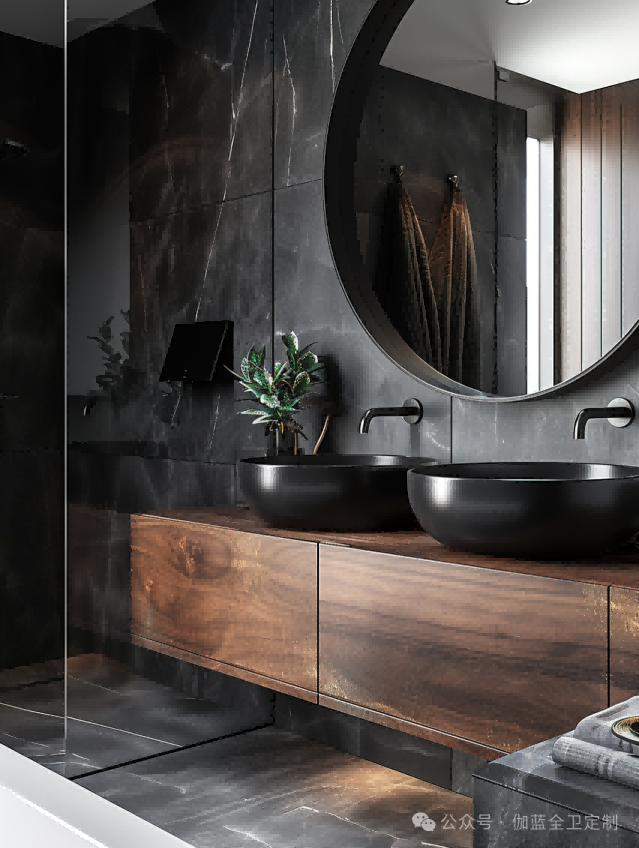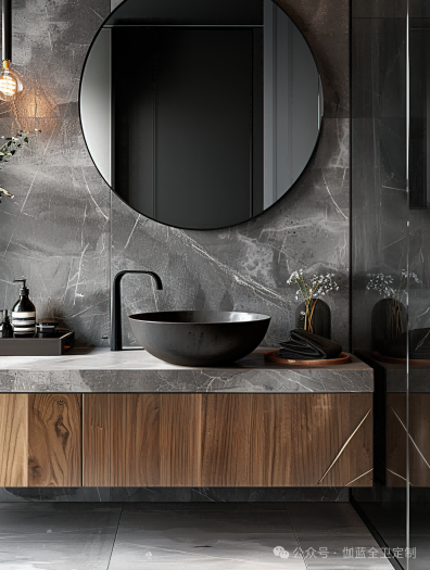 一个黑色胡桃木搭配深灰大理石墙面的浴室柜,创造出了一种奢华而沉稳的氛围。深色的胡桃木与大理石纹理形成对比,让空间中的每一件装饰都更加突出。圆润的盆和简约的龙头设计使得整体空间既现代又具有实用性。