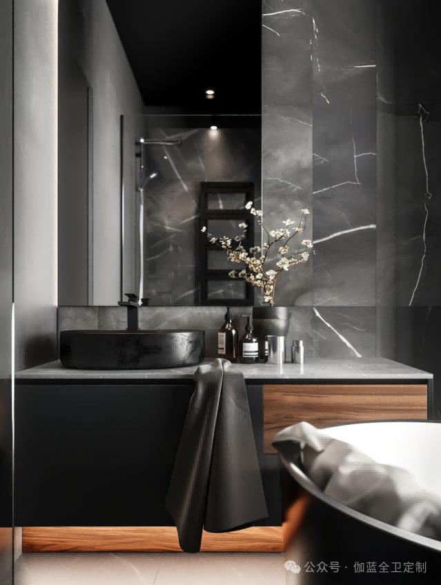 黑色胡桃木与黑金大理石相结合,营造出一种非常现代且高端的设计风格。黑金大理石给人以强烈的视觉冲击力,同时黑色胡桃木柜体的温暖木质感为这个空间带来了必要的温馨感,确保了不会过于冷硬。