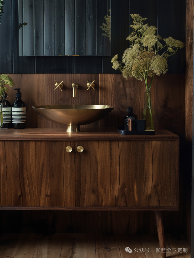 深色胡桃木与墨黑色的墙面相结合,再加上金色的洗手盆,体现了一种低调的奢华。这样的设计方案为室内空间增添了一种别样的质感,金色元素的加入则为整体设计增添了一抹亮色,提升了空间的视觉焦点。