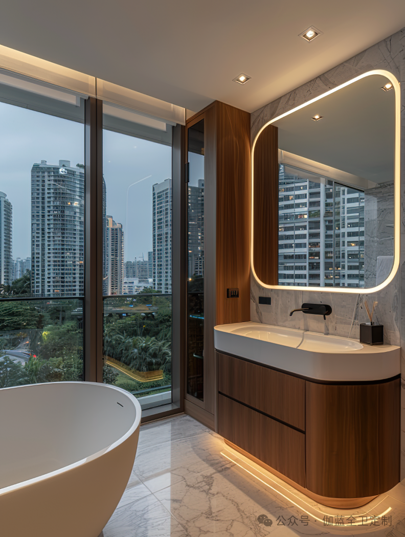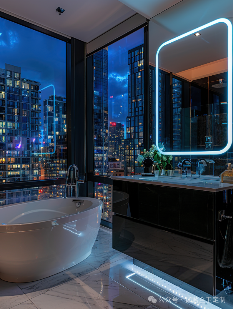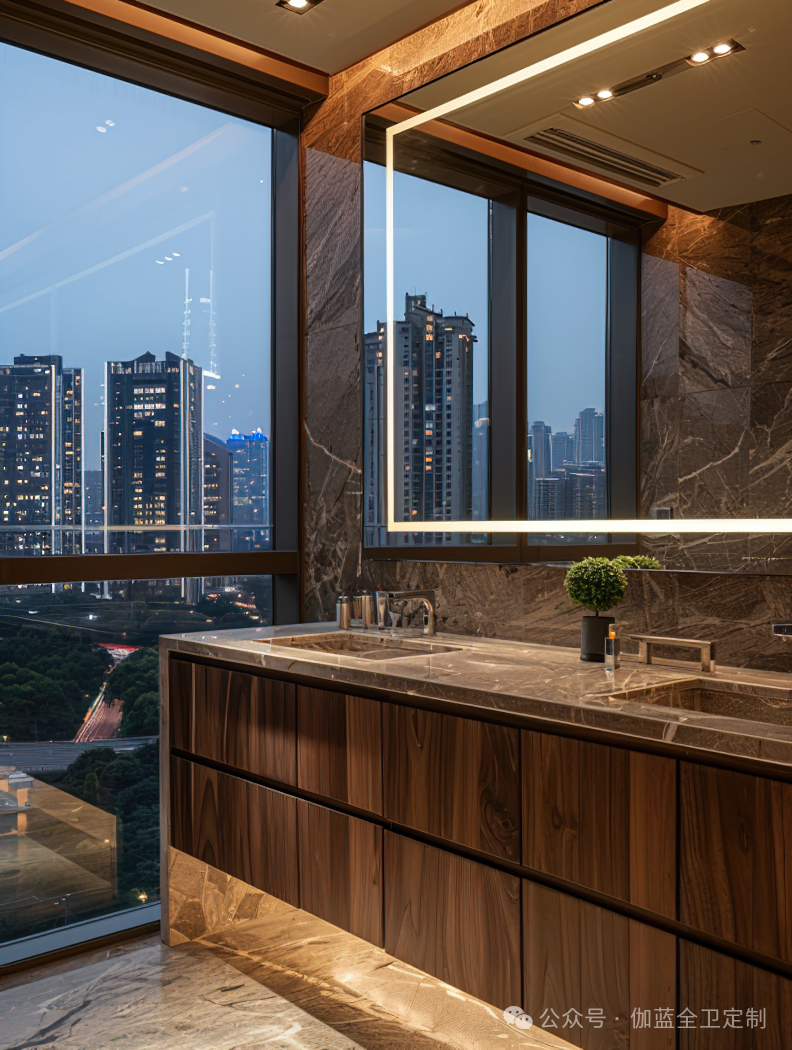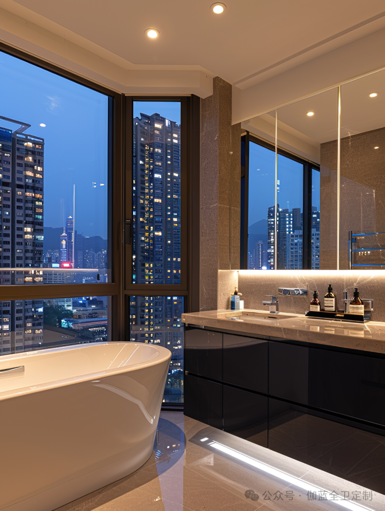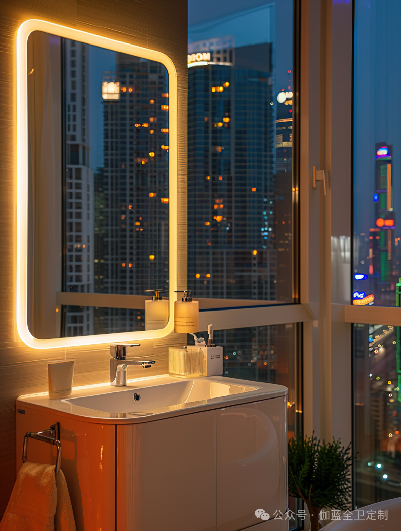 夜幕降临,城市的灯火与星辰争辉。黑暗中的闪烁,每一款浴室柜都如同夜空中最亮的星,独特的设计语言倾诉着酒店式生活的奢华与舒适。