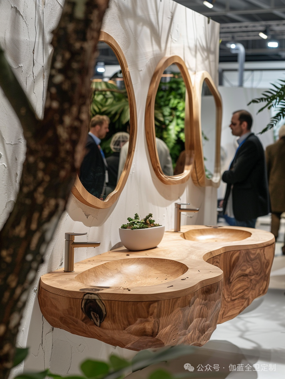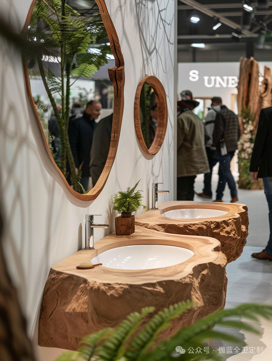 原木的自然纹理和质感被发挥到极致。不规则的镜框和厚实的原木柜体,仿佛带你走进一片宁静的森林。柜体和镜框采用天然原木材质,保留了木材的天然纹理,充满自然气息。不锈钢水龙头与原木形成鲜明对比,增添了现代感。通过这款设计,我们希望你能在繁忙的生活中,找到一片心灵的净土。