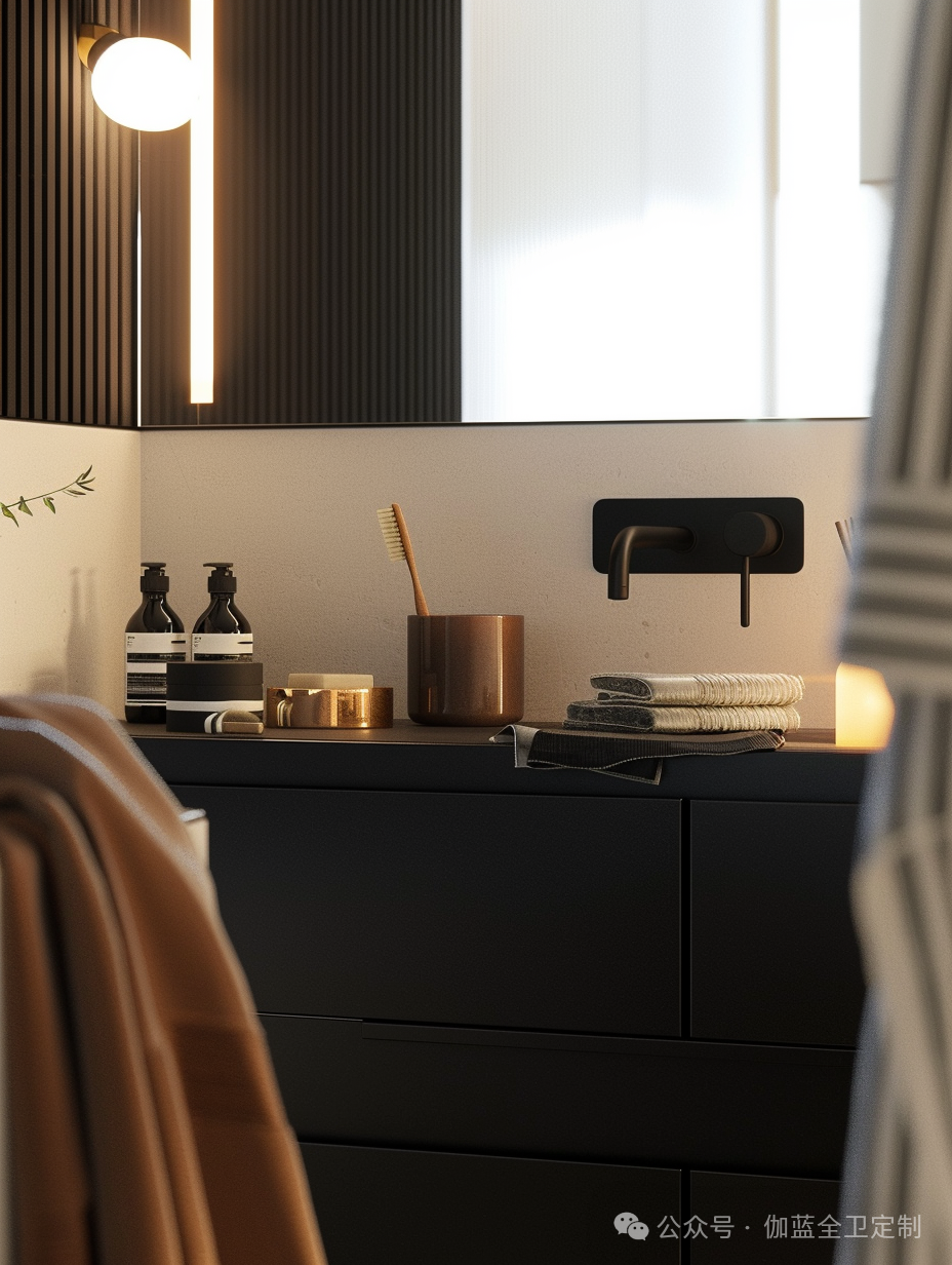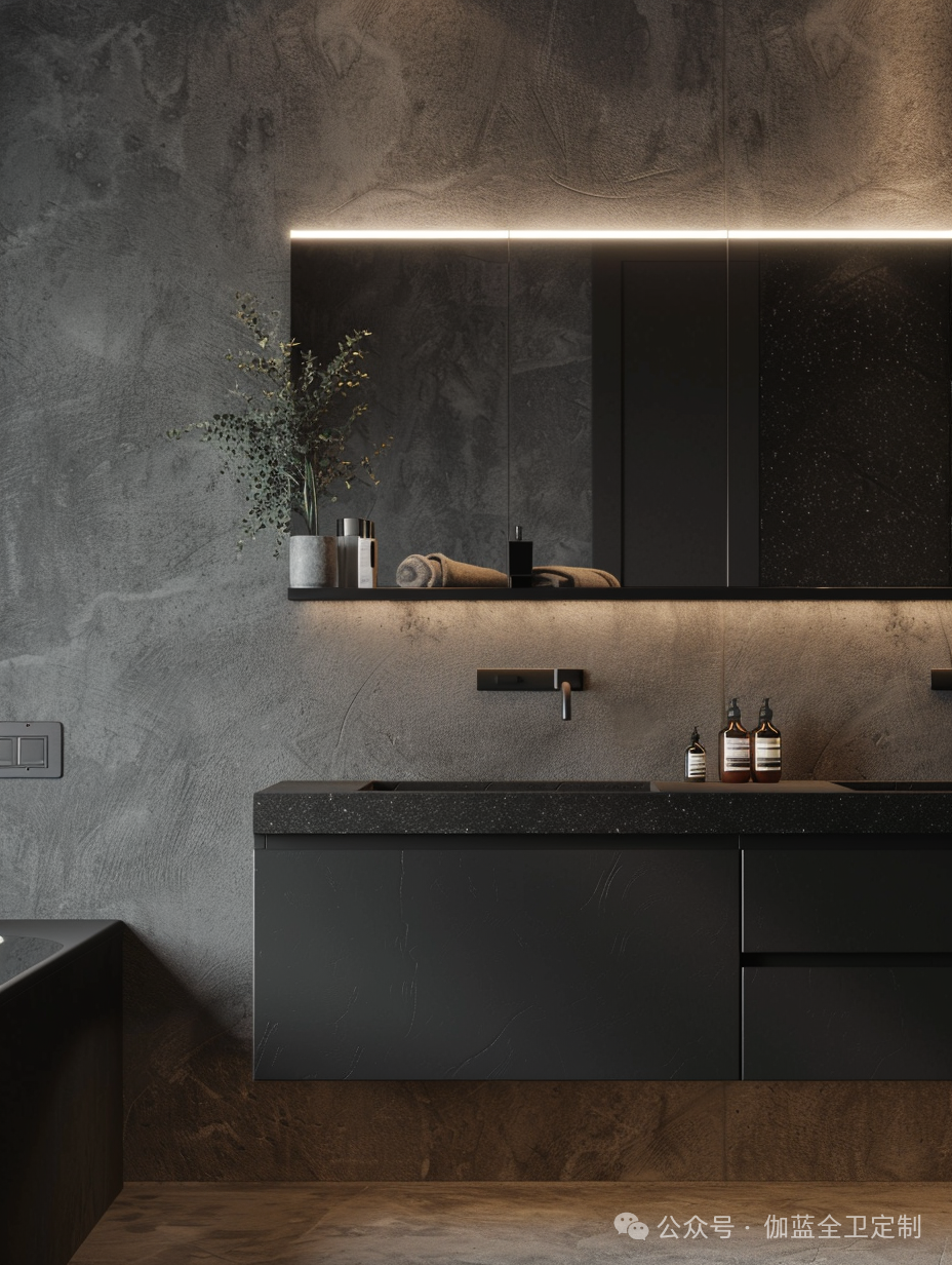 浴室柜采用了黑色磨砂材质,展现出极简与现代的完美结合。柜体设计流畅,线条干练,与纽约摩天大楼的直线美学相呼应。灯带隐藏在镜子背后,柔和的光晕为整个空间增添了一丝温暖和时尚感。黑色的墙面与柜体相互映衬,凸显出设计的层次感和深邃感。