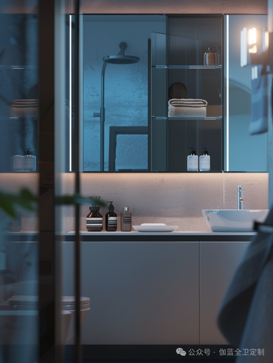 冷灰色成为主色调,象征着纽约冬季的清冷与优雅。柜体和墙面的冷灰色调相互交织,创造出一种低调而不失格调的氛围。镜子的蓝色反光与冷灰色柜体相得益彰,仿佛将纽约夜晚的城市灯光引入室内。洗手台采用简单的线条设计,呈现出纯粹的现代美感。