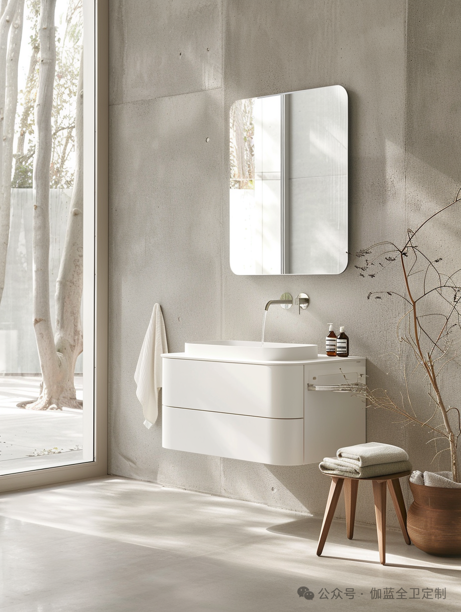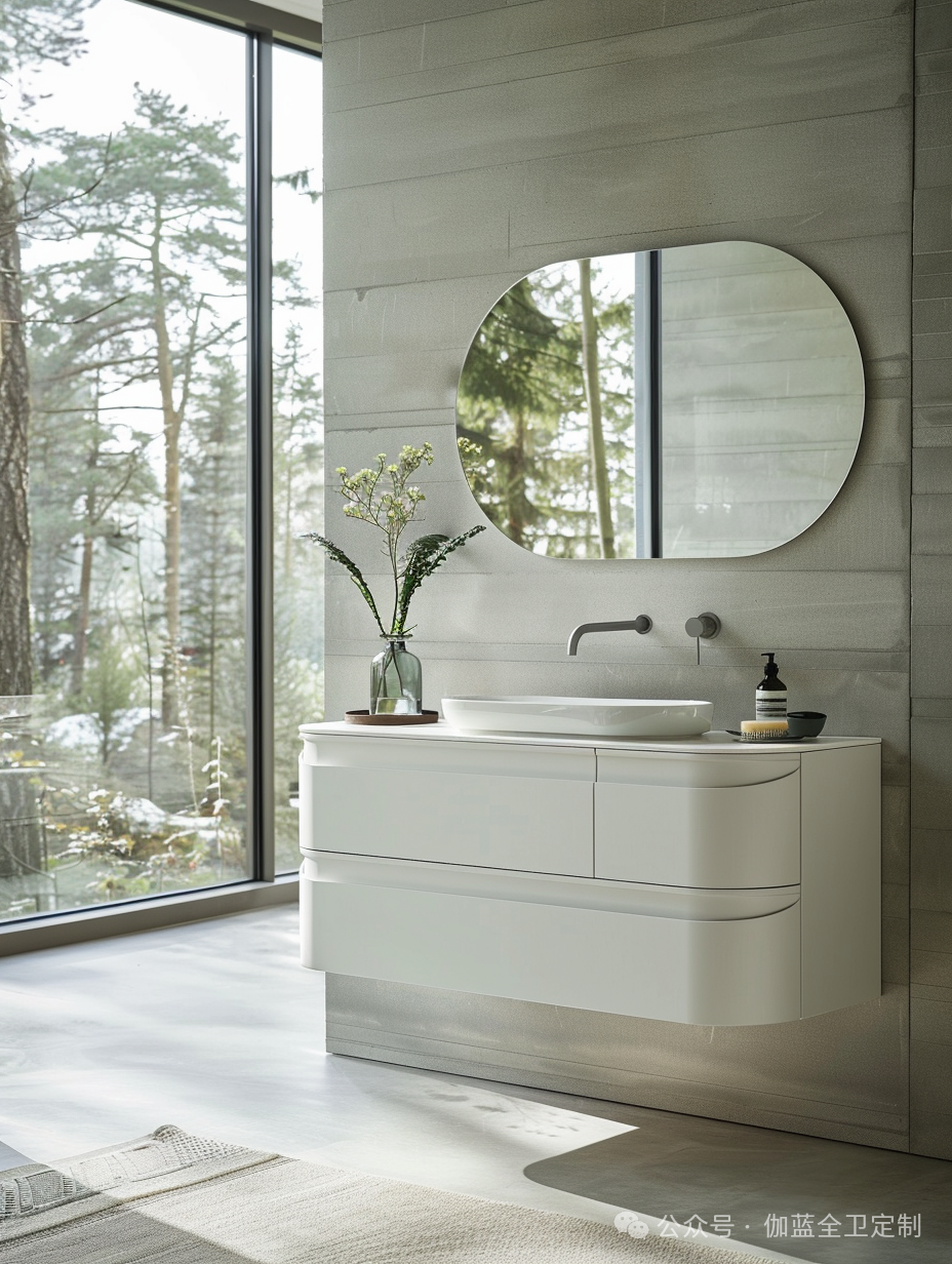以简约自然为设计主题,白色波纹柜体与自然光线和窗外的绿意相得益彰。圆形镜子和简洁的线条设计,充分体现了北欧设计的极简主义和功能性。这里没有多余的装饰,一切都显得那么纯粹而宁静。这款设计不仅营造出宁静的氛围,更让人感受到大自然的美好。