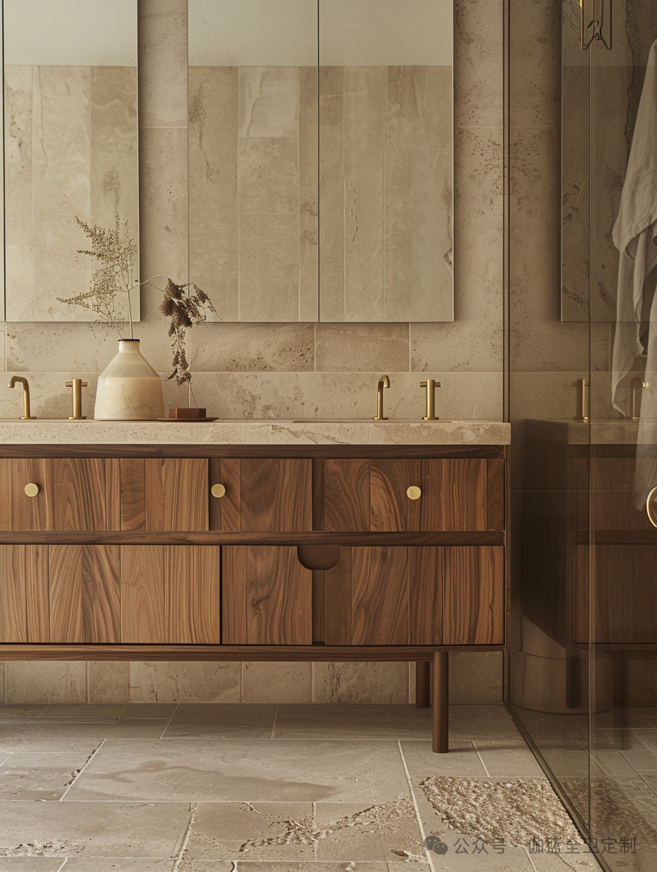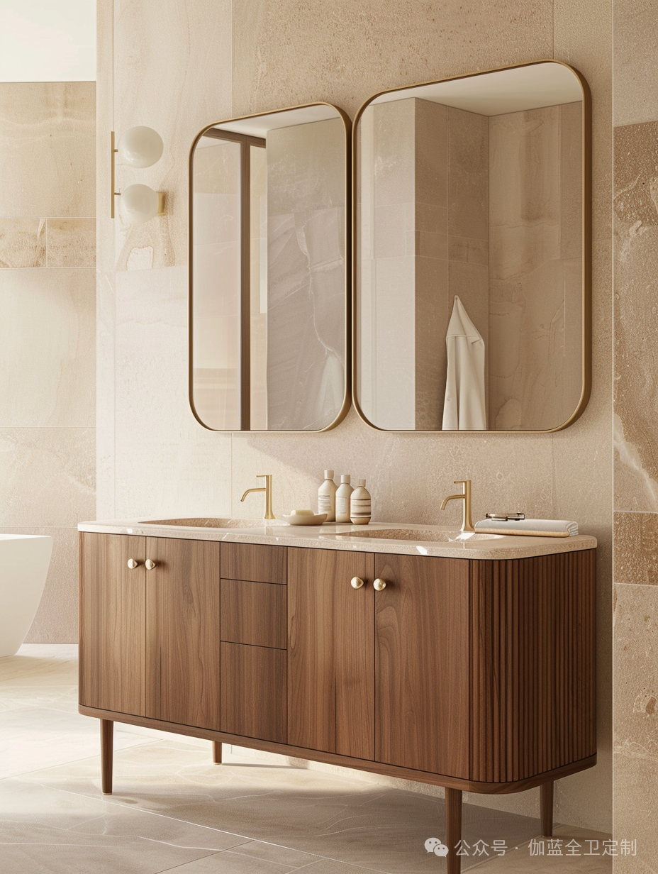 以现代经典风格为设计理念,采用温暖的木质材料和精致的金属装饰。柜体的线条简洁流畅,凸显出高雅的气质。大镜子和独特的灯具设计,使整个空间显得明亮开阔,同时又带有一丝温馨的氛围。这款设计不仅展现了现代的优雅,更让人感受到家的温暖。