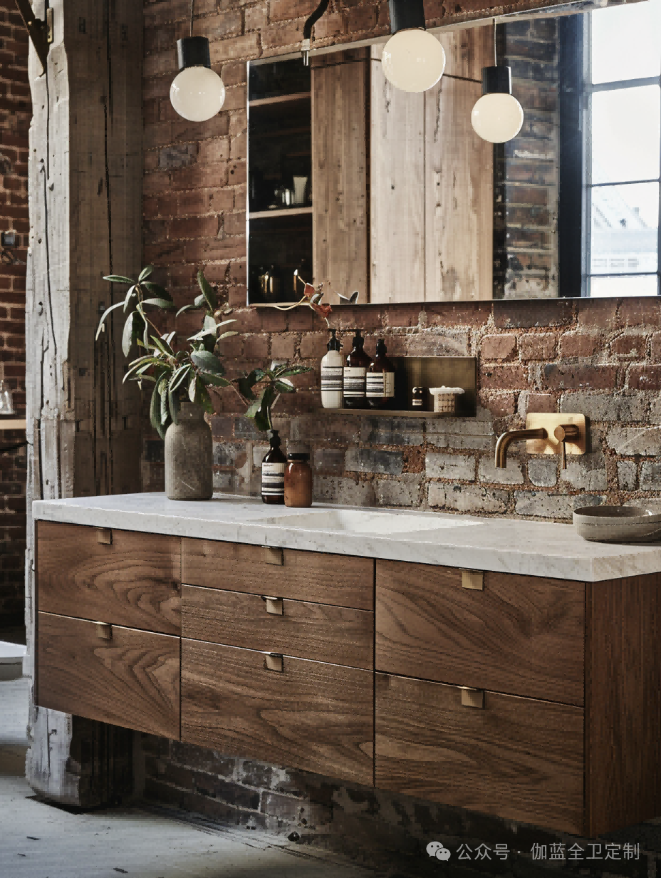 浴室柜融入了工业复古风格,结合了粗犷的砖墙和精致的木质柜体。金属与木材的结合,让空间充满了历史感和质感。简单大方的镜子设计,与周围环境完美融合,带给人一种回到过去的怀旧感,同时又不失现代感。这款设计不仅具有视觉冲击力,更让人感受到岁月沉淀下来的独特韵味。
