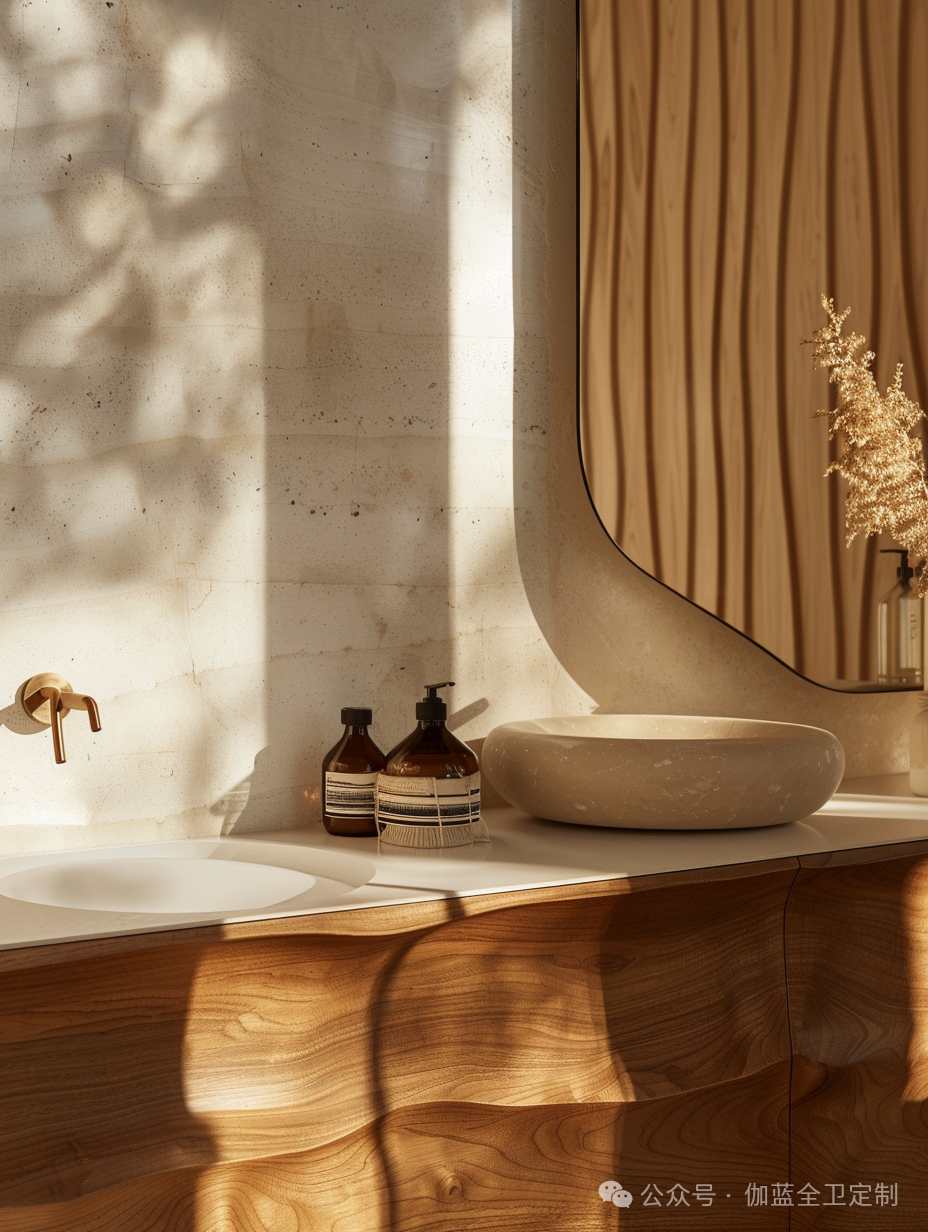 浴室柜的曲线设计灵感来源于自然界中的河流和山脉,木材的纹理和温暖的色调进一步增强了这种自然感。无论是视觉上还是触觉上,这款浴室柜都给人一种回归自然的感觉。