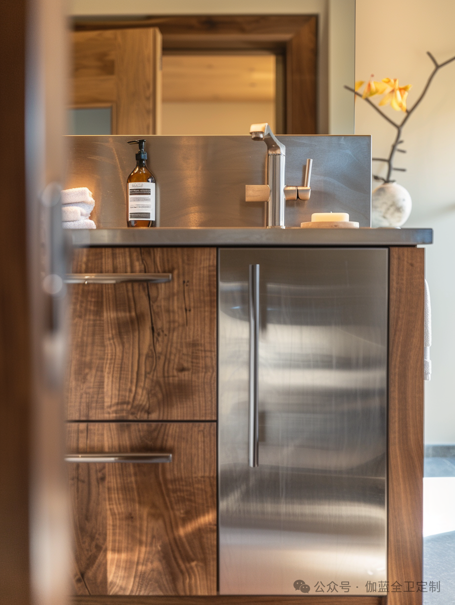 浴室柜采用了高品质的木材与不锈钢结合,形成了一个既现代又经典的设计。光滑的表面和简洁的线条不仅美观大方,而且非常易于清洁和维护,充分体现了野口勇对功能性的重视。