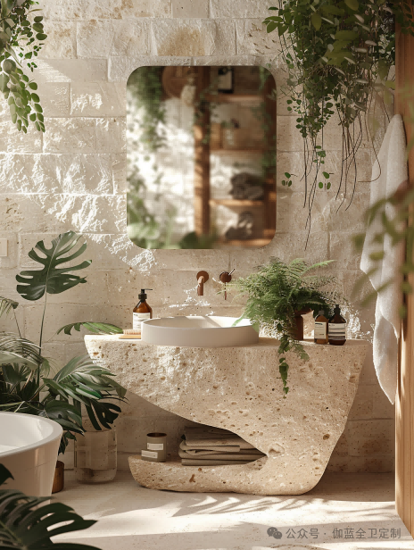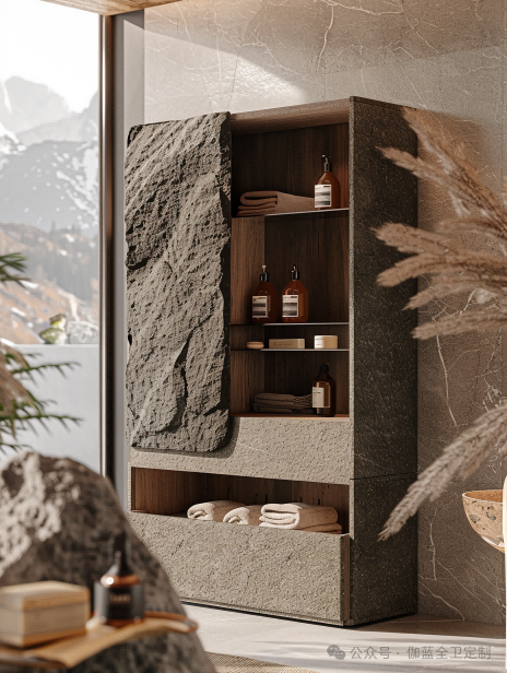 浴室柜采用天然石材和木材的组合,不仅在视觉上给人一种沉稳大气的感觉,而且通过灯光和材质的巧妙结合,使整个空间更加和谐美观。它不仅是一个独立的艺术品,更是与整个卫浴空间融为一体的设计杰作。