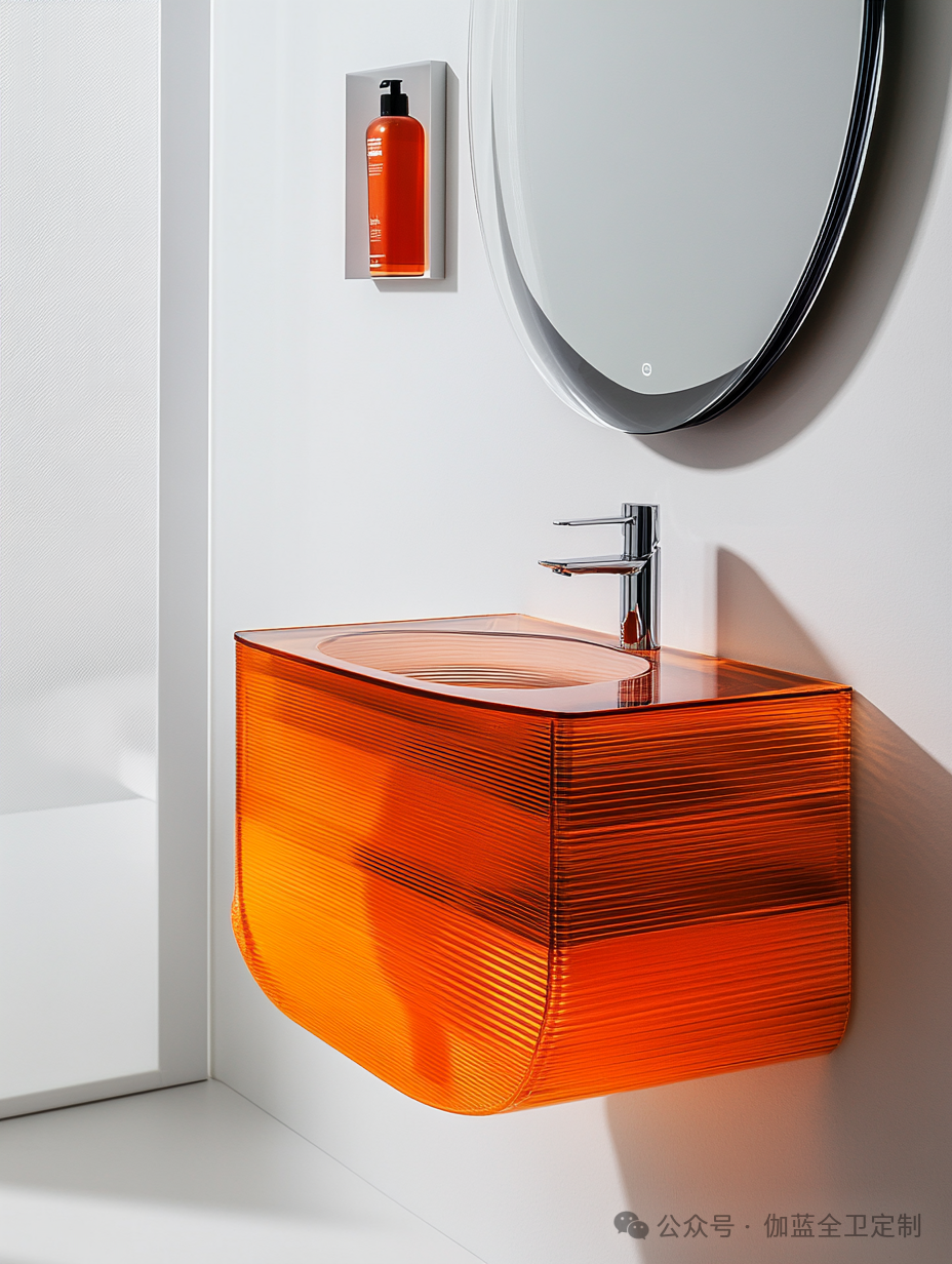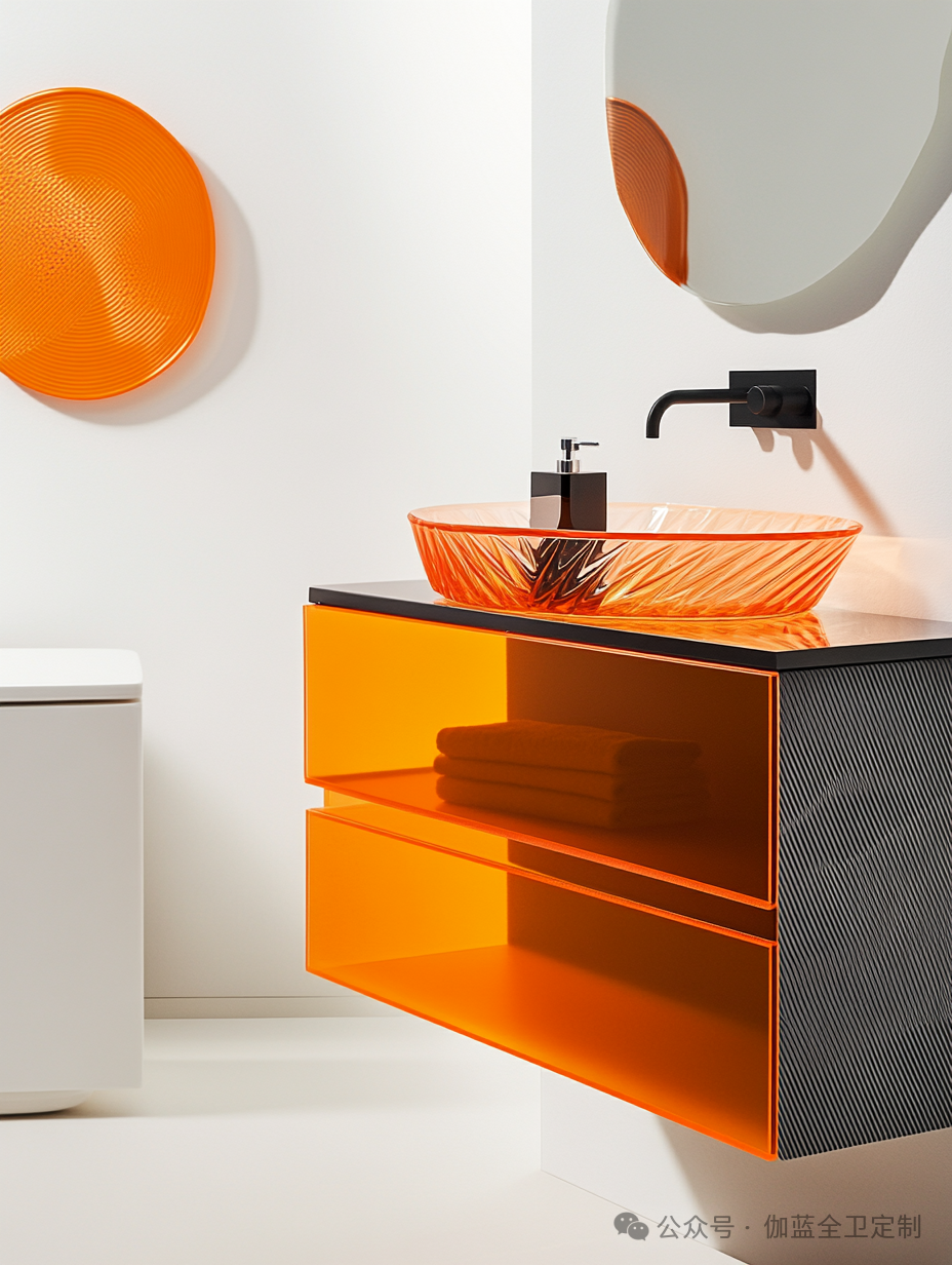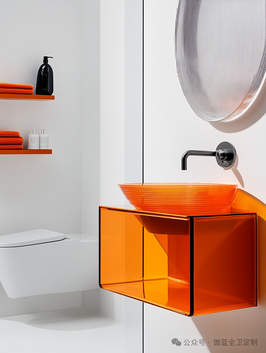 斯塔克以大胆的色彩运用著称,他的设计往往打破传统,展现出强烈的视觉冲击力。以明亮的橙色为主调,采用高科技透明材料,整个设计充满了现代感和未来感。简洁的结构和鲜明的色彩,让这款浴室柜在简约中透露出独特的时尚气息。