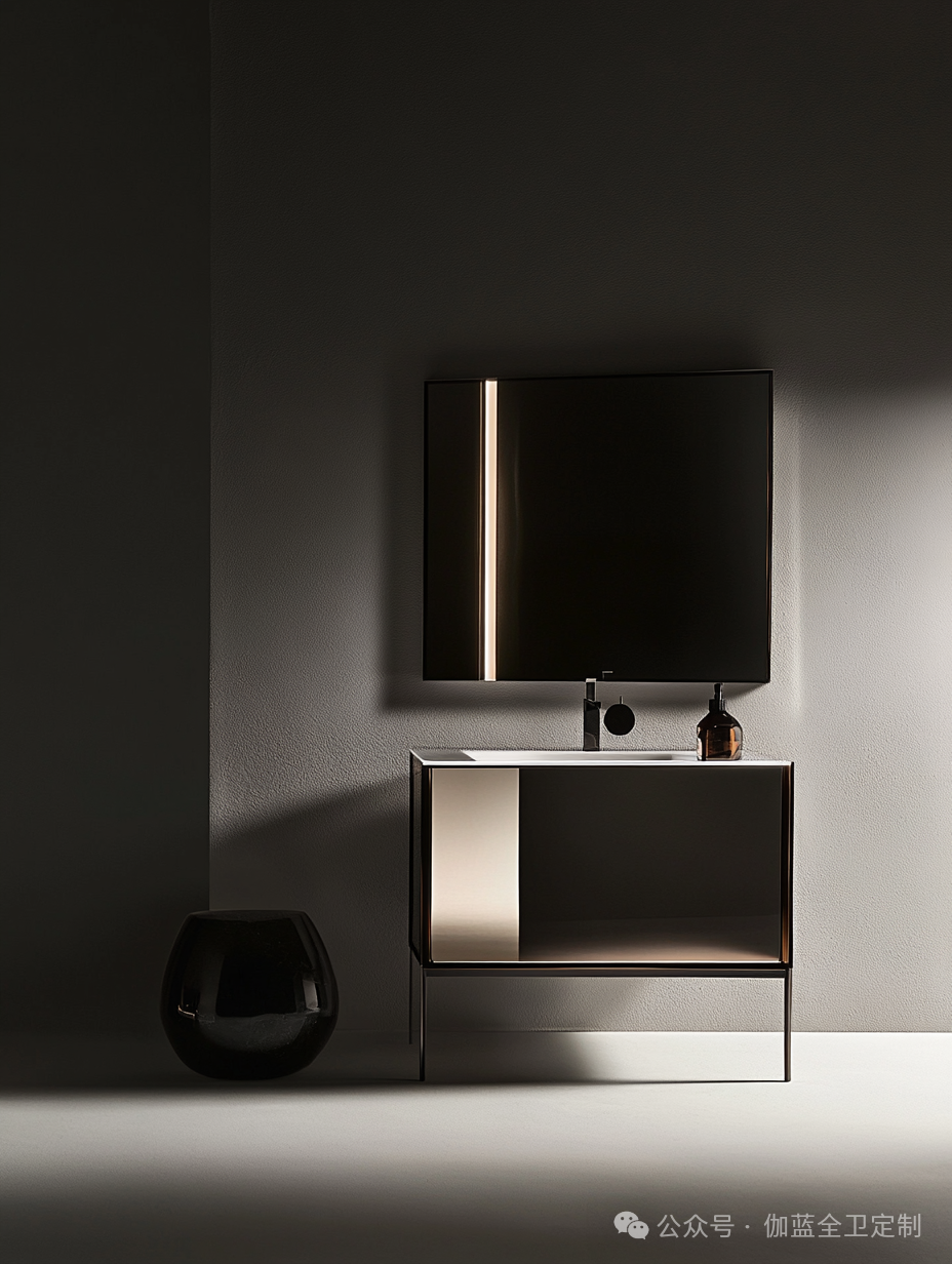 斯塔克擅长使用高科技材料,并以创新的方式将其融入设计中。采用了高光漆面和镜面不锈钢材质,整体设计极简且前卫。独特的结构和照明设计,使得浴室空间充满了现代科技感与艺术氛围。