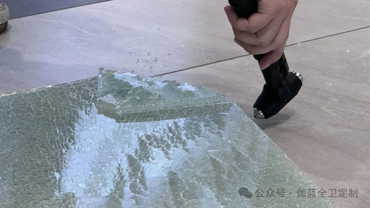 夹胶玻璃vs贴膜钢化玻璃的安全性试验:上图为贴膜玻璃,敲碎后会折断且有断口,下图为夹胶玻璃,敲碎后仍然可以直立且可以用手触摸。