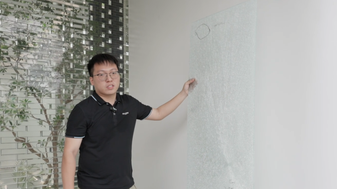 在淋浴房展示环节,淋浴房研发负责人关啟荣开展了夹胶玻璃安全试验演示,通过与钢化玻璃的对比,真实呈现了夹胶玻璃在安全性方面的高标准;此外,关总讲解了各系列淋浴房产品,让直播间的朋友们切身感受到了伽蓝在安全性与技术上的核心优势与突破。