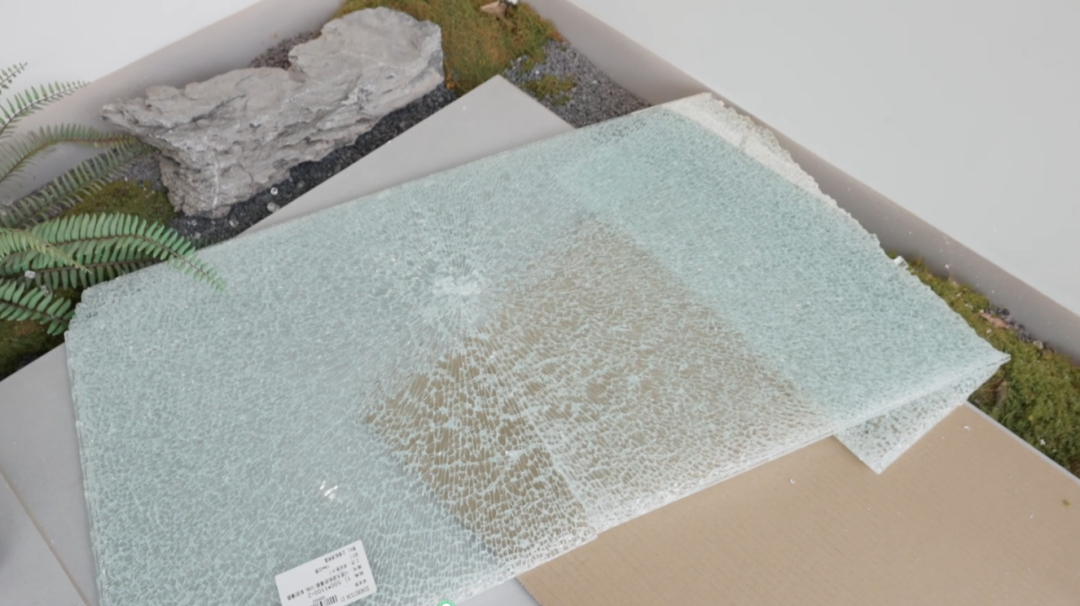贴膜钢化玻璃vs夹胶玻璃的安全性试验:上图为贴膜玻璃,敲碎后会折断且有断口,下图为夹胶玻璃,敲碎后仍然可以直立且可以用手触摸。