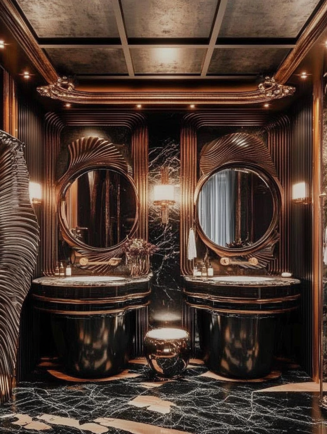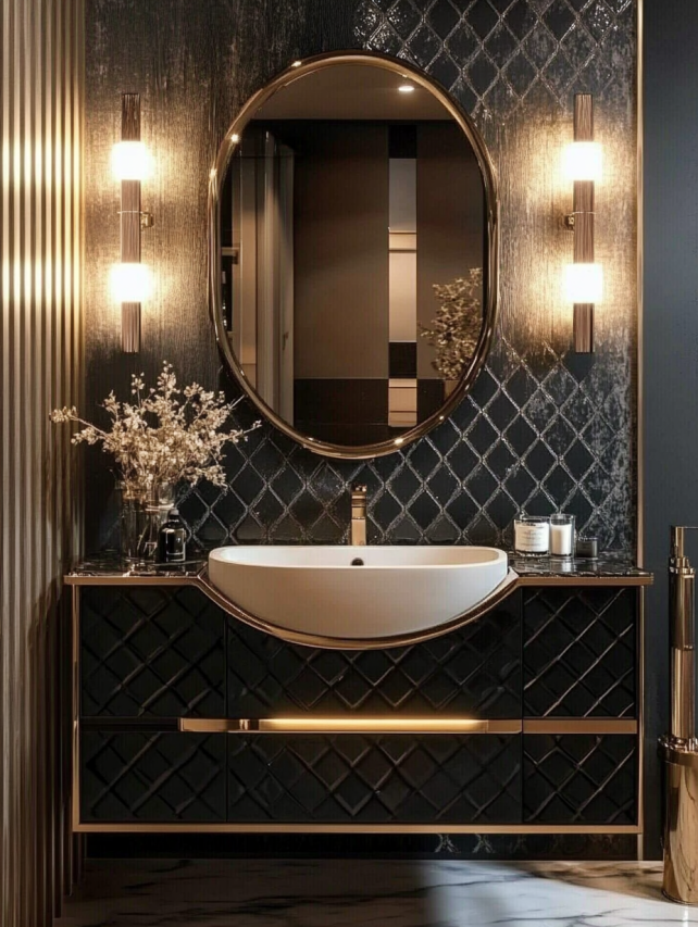 下图设计以金色为主调,墙面闪耀如繁星点点,搭配黑色圆形台盆与金边镜面,如同“夜空下的一弯新月”。洗漱台下柜采用大理石纹理,融入现代极简与奢华优雅的结合。金色壁面仿佛将时间凝固,给人以温暖与从容之感。