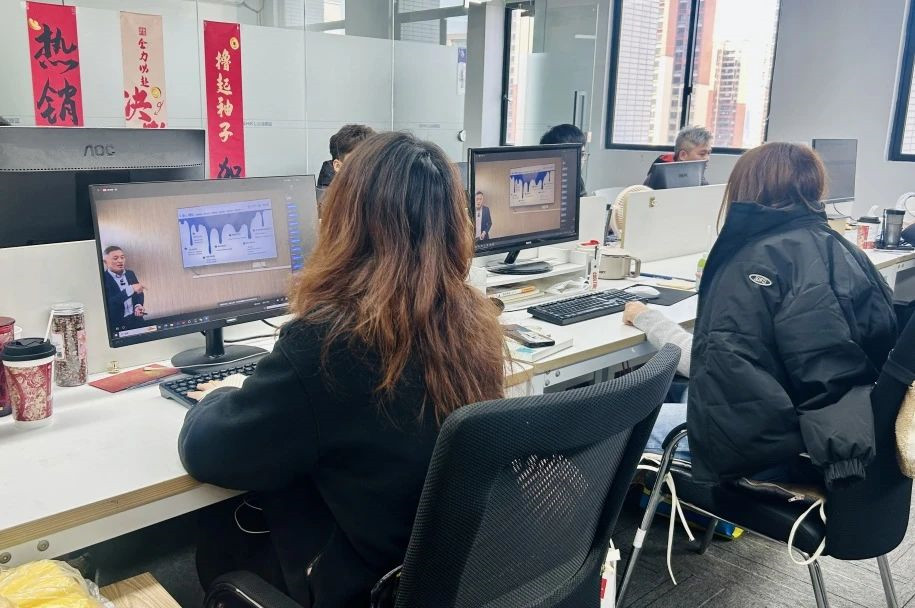张爱民董事长于佛山·智慧新城总部开展“新年第一课”演讲,佛山总部、赢伽电商伽蓝人及全体经销商伽人于屏幕前学习,共同开启崭新的一年。