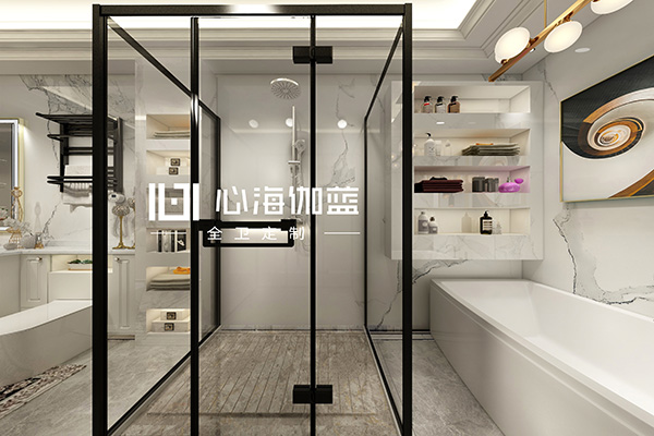 一字形布局功能区,顺序按梳洗区、马桶区、淋浴房、浴缸以此排列。为适应大部分人群的行为动线,把最频繁使用的洗手台跟马桶放在最外面靠门处,较少使用的浴缸放在最里面。