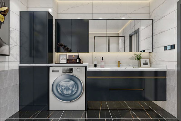 嵌入式洗衣机设计,因为空间户型有柱子的原因,心海伽蓝全卫定制设计师便给浴室柜做定制,左边洗衣区,右边洗漱区,还能在洗衣机旁边再增添一个闭合式收纳侧柜。