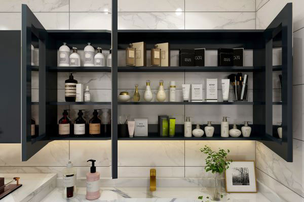 谁说空间整洁就一定要物品少?洗漱区镜子采用镜柜设计,合上是干净整洁又明亮的大镜子,打开就是储物空间,再多的瓶瓶罐罐都可收纳其中,更不用担心空间杂乱。