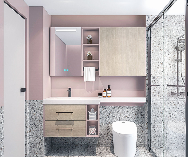 【功 能】:上方墙面组合式智能镜柜;马桶边前边,侧边开放格设计方便拿取两方物品;台面延伸到马桶上方,更好利用马桶上方空间