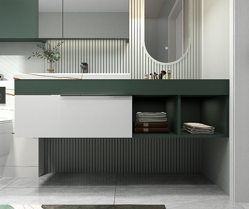 【功 能】:跑道圆镜面自带灯光即可全方位映照美貌;梳妆格区隔分明,收纳明确;镜柜大容量收纳,琐碎物品都能装;浴室柜和坐便器悬空不留卫生死角
