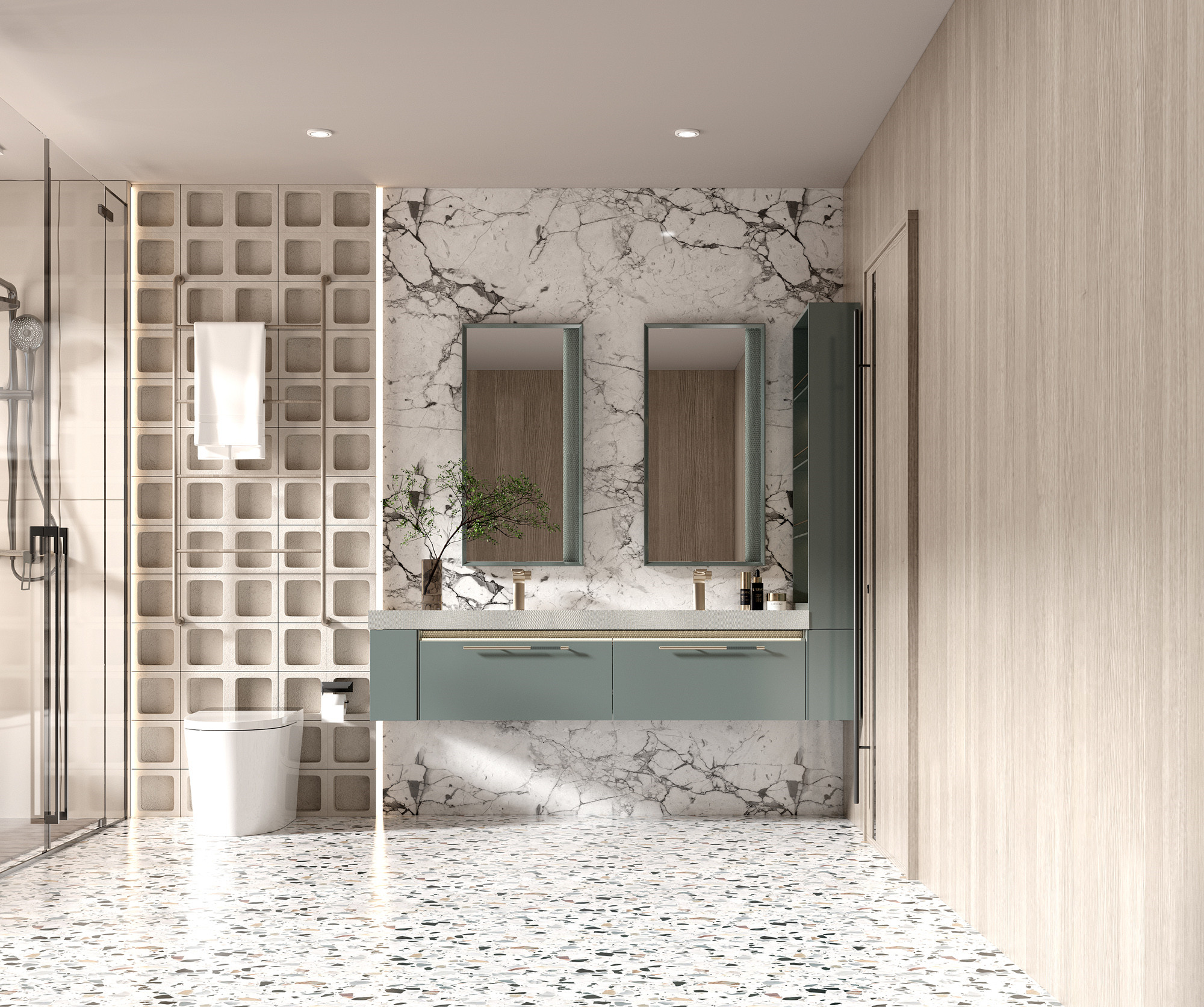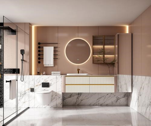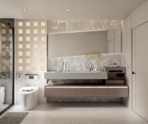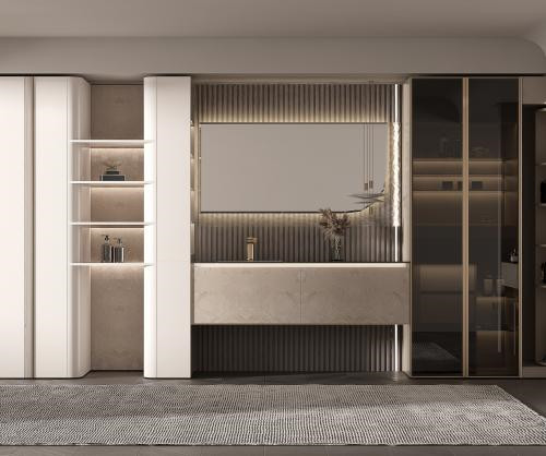 【功 能】:双镜搭配三角形浮雕几何纹理外框,侧发光设计平衡窗户日光的光线不匀问题;采用无缝拼接盆;梳妆带灯玻璃层板梳妆高柜,减少不必要的柜门开合。