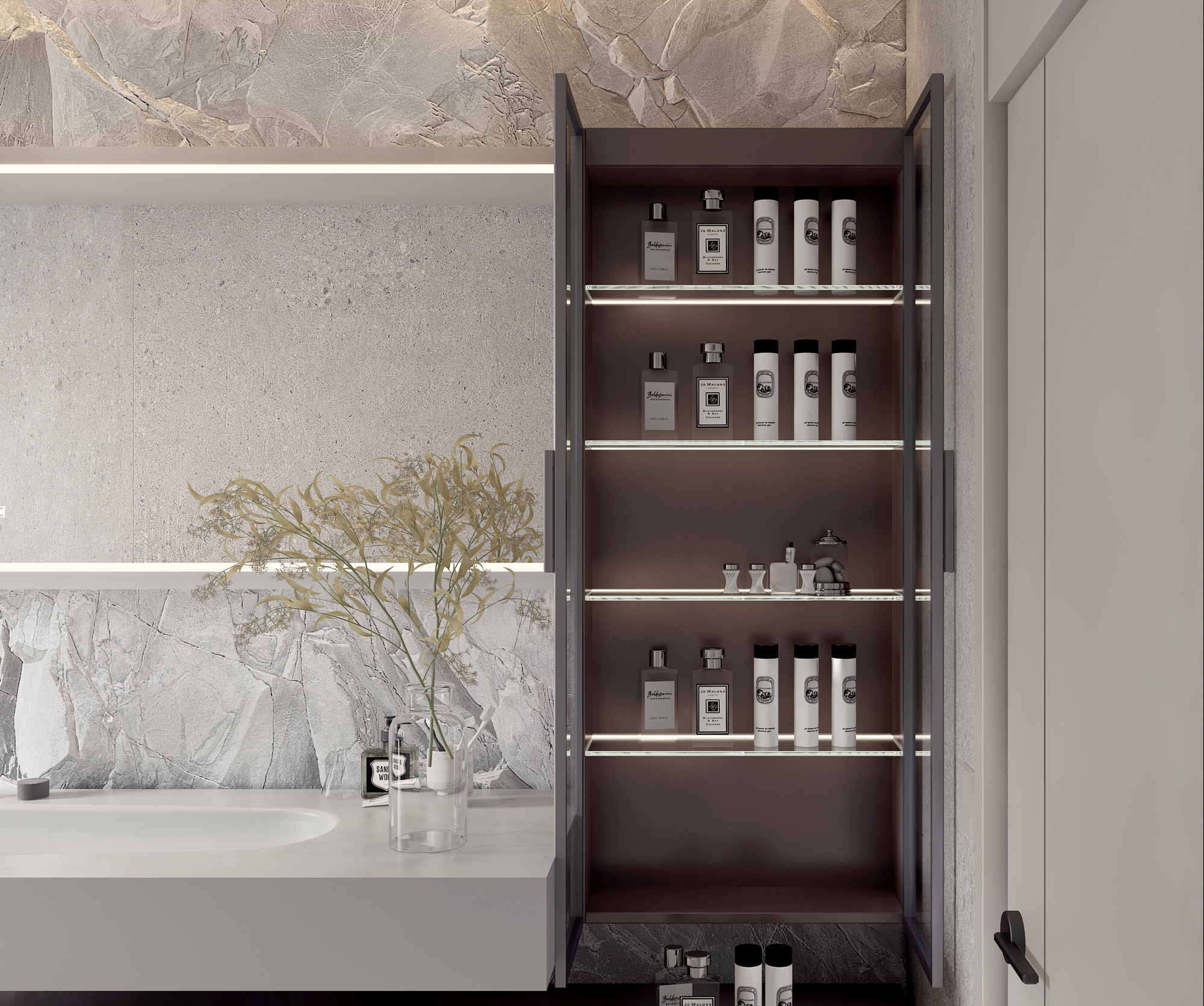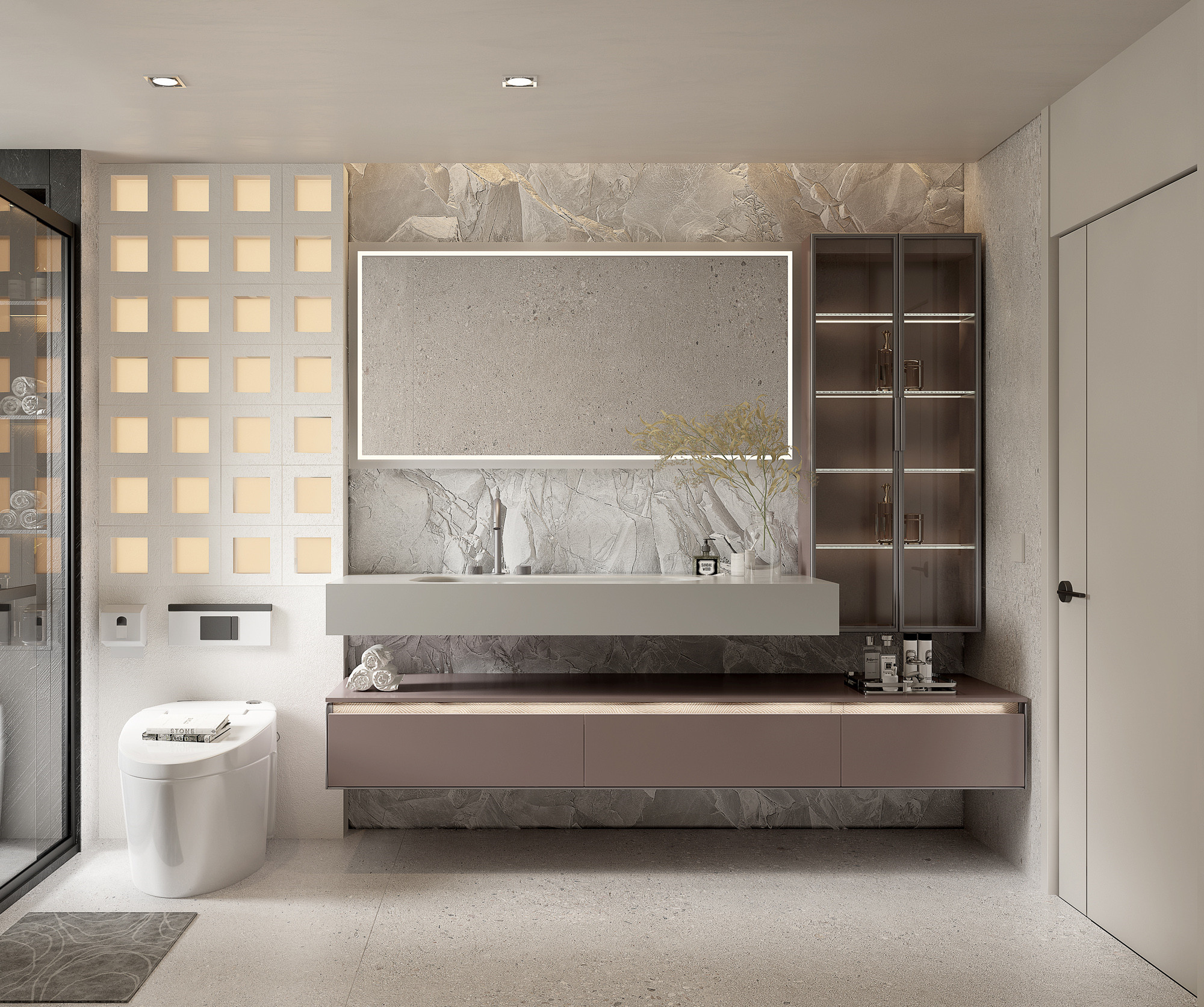 【功 能】:超大盆腔;植入消毒烘干机:洗漱完毕可将贴身衣物烘干;一片式前发光智能镜全包围细边发光区,日常使用更聚光更清晰增加蓝牙语音功能。
