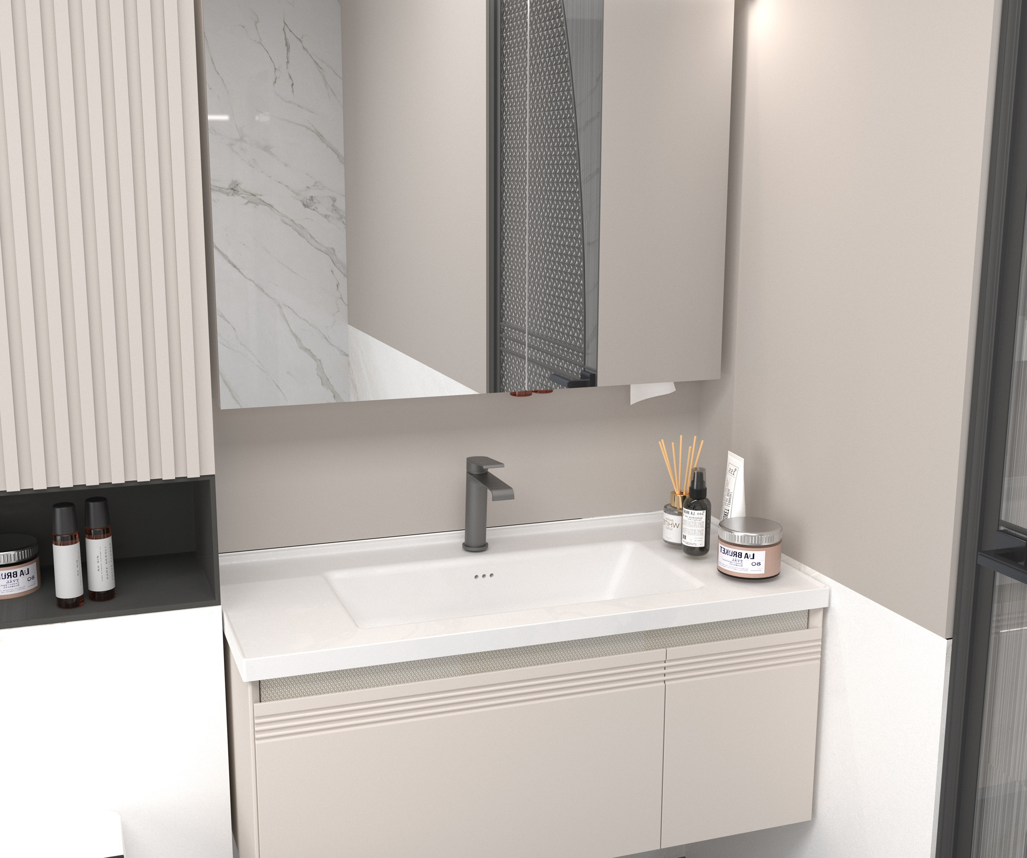 【主柜颜色】:卡其灰免漆板+羊绒灰油漆