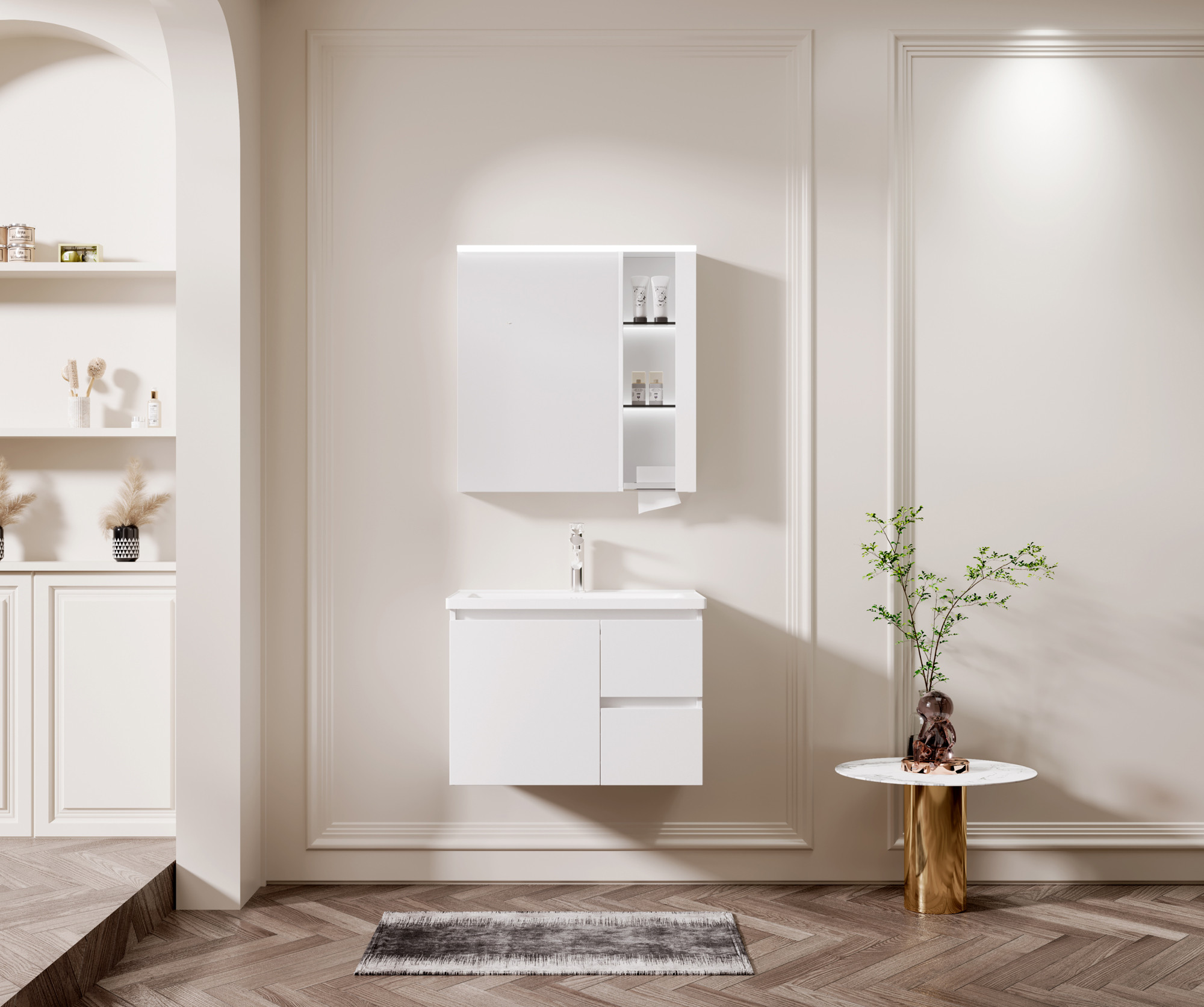 【主柜颜色】:雨丝白免漆板+单面哑白pet肤感+单面