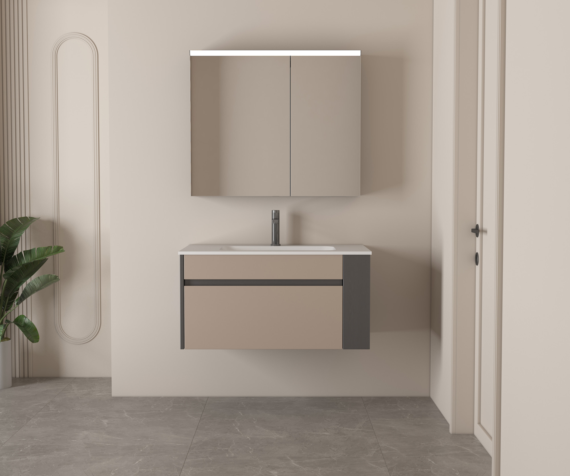 【主柜颜色】:铁灰树皮纹免漆板+卡其灰油漆